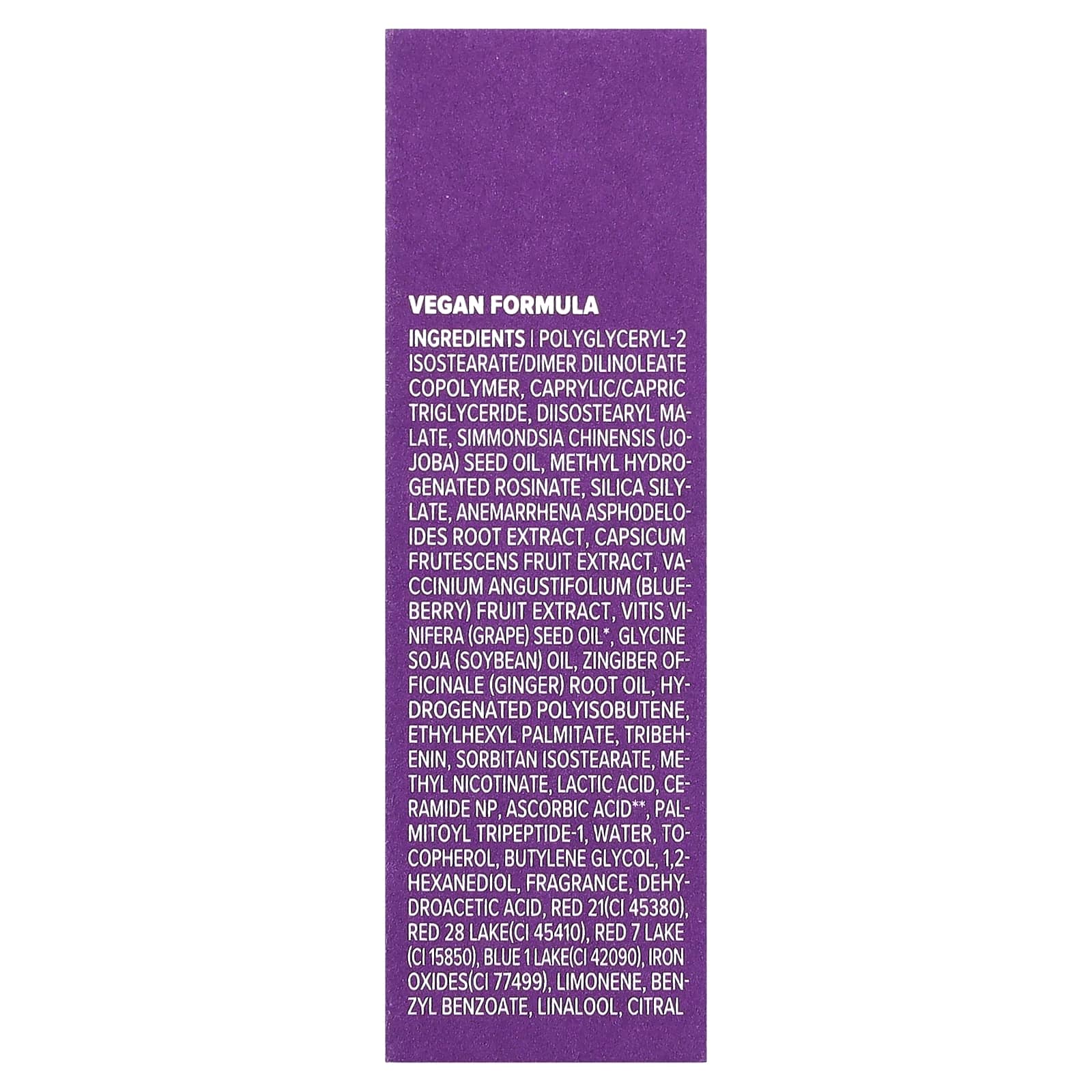 Полиглицерил-2 изостеарат/димер дилинолеат сополимер, каприловый/каприновый триглицерид, диизостеарил малат, масло из семян жожоба (Simmondsia chinensis), метил-гидрогенизированный розинат, силилат диоксида кремния, экстракт корня анемаррены асфоделевой (Anemarrhena asphodeloides), экстракт перца (Сapsicum frutescens), экстракт ягод голубики (Vaccinium angustifolium), масло из виноградных косточек (Vitis vinifera), соевое масло (Glycine soja), масло корня имбиря (Zingiber officinale), гидрогенизированный полиизобутен этилгексил пальмитат, трибехенин, сорбитан изостеарат, метил никотинат, молочная кислота, керамид NP, аскорбиновая кислота, пальмитоил трипептид-1, вода, токоферол, бутиленгликоль, 1,2-гександиол, отдушка, дегидроуксусная кислота, краситель красный 21 (CI 45380), краситель красный 28 лак (CI 45410), краситель красный 7 лак (CI 15850), краситель синий 1 лак (CI 42090), оксиды железа (CI 77499), лимонен, бензилбензоат, линалоол, цитраль.