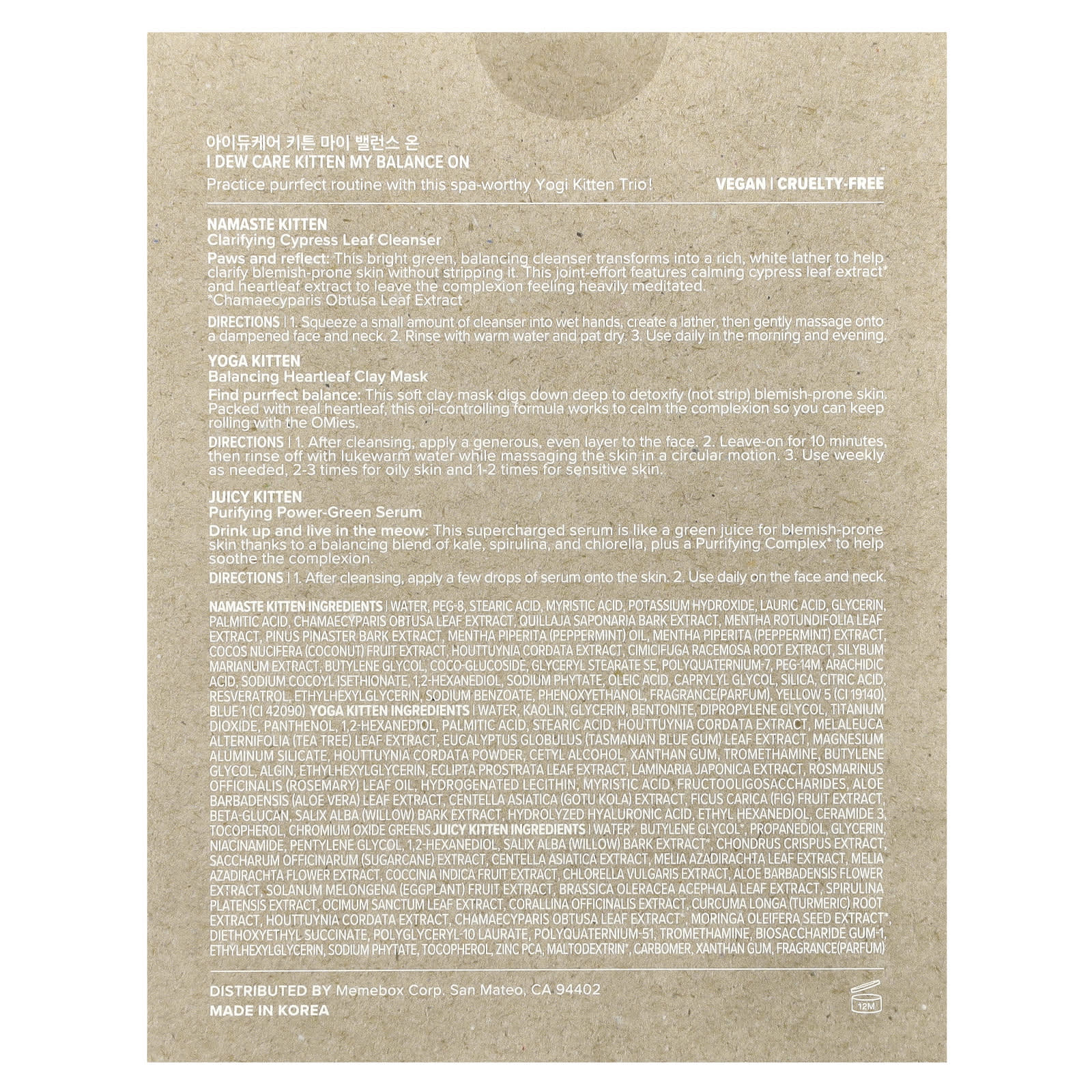 Йога-котенок: Вода, каолин, глицерин, бентонит, дипропиленгликоль, диоксид титана, пантенол, 1,2-гександиол, пальмитиновая кислота, стеариновая кислота, экстракт хауттюйнии (Houttuynia cordata), экстракт листьев чайного дерева (Melaleuca alternifolia), экстракт листьев эвкалипта шаровидного (Eucalyptus globulus), алюмосиликат магния, порошок из хауттюйнии (Houttuynia cordata), цетиловый спирт, ксантановая камедь, трометамин, бутиленгликоль, альгин, этилгексилглицерин, экстракт листьев эклипты простертой (Eclipta prostrata), экстракт ламинарии японской (Laminaria japonica), масло из листьев розмарина (Rosmarinus officinalis), гидрогенизированный лецитин, миристиновая кислота, фруктоолигосахариды, экстракт листьев алоэ вера (Aloe vera), экстракт готу колы (Centella asiatica), бета-глюкан из экстракта плодов инжира (Ficus carica), экстракт коры ивы (Salix alba), гидролизованная гиалуроновая кислота, этил гександиол, керамид 3, токоферол, оксид хрома и зелень.