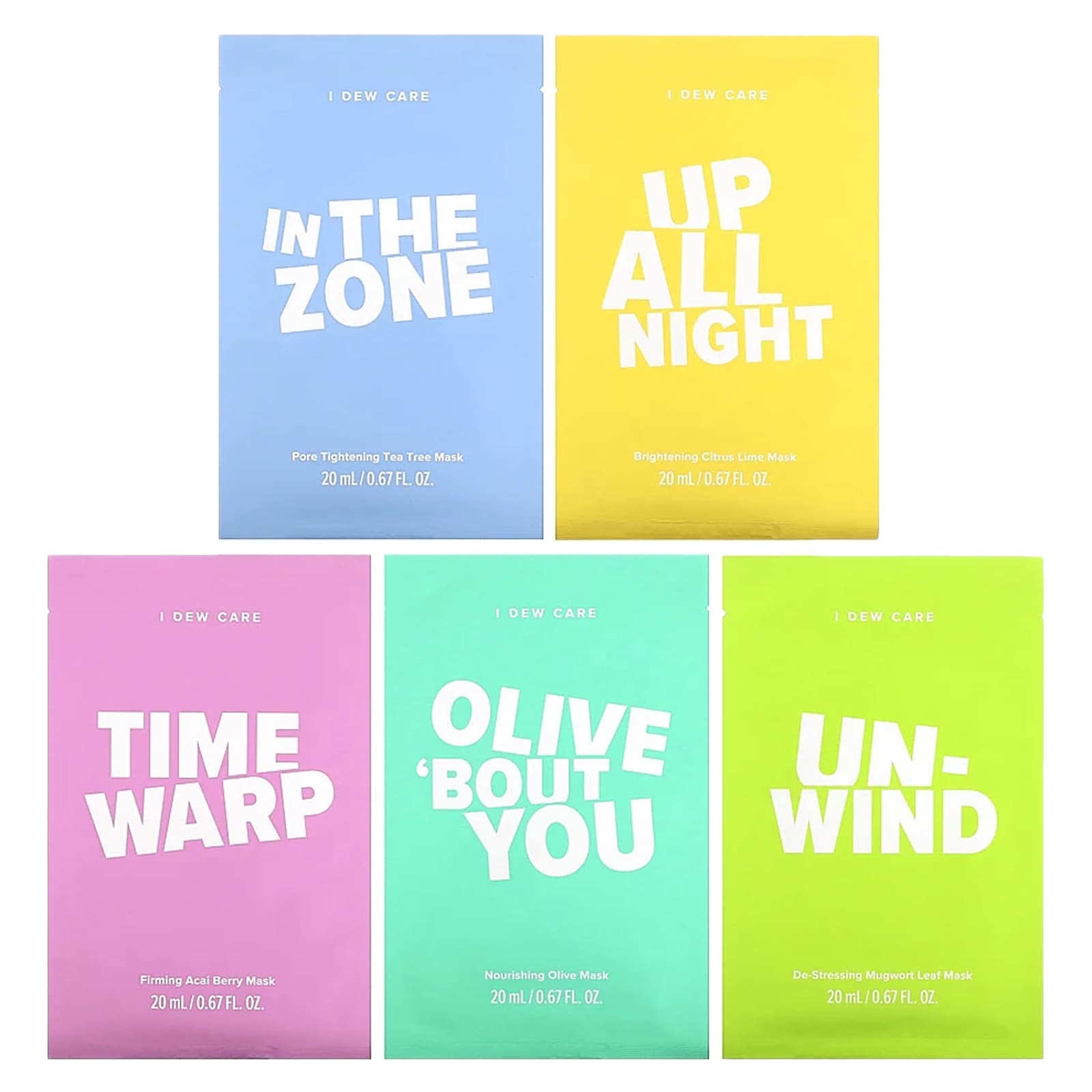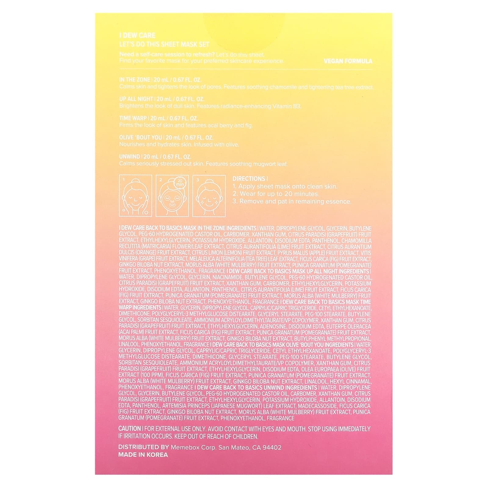Маска I dew Care Back to Basics из ингредиентов: Вода, дипропиленгликоль, глицерин, бутиленгликоль, ПЭГ-60 гидрогенизированное касторовое масло, карбомер, ксантановая камедь, экстракт плодов грейпфрута (Citrus paradisi), этилгексилглицерин, гидроксид калия, аллантоин, двунатриевая ЭДТК, пантенол, экстракт цветков/листьев ромашки (Chamomilla recutita), экстракт плодов лайма (Citrus aurantifolia), экстракт плодов апельсина (Citrus aurantium dulcis), экстракт лимона (Citrus limon), экстракт яблока (Pyrus malus), экстракт плодов винограда (Vitis vinifera), экстракт листьев чайного дерева (Melaleuca alternifolia), экстракт плодов инжира (Ficus carica), экстракт орехов гинкго билоба, экстракт плодов белой шелковицы (Morus alba), экстракт плодов граната (Punica granatum), феноксиэтанол, отдушка.