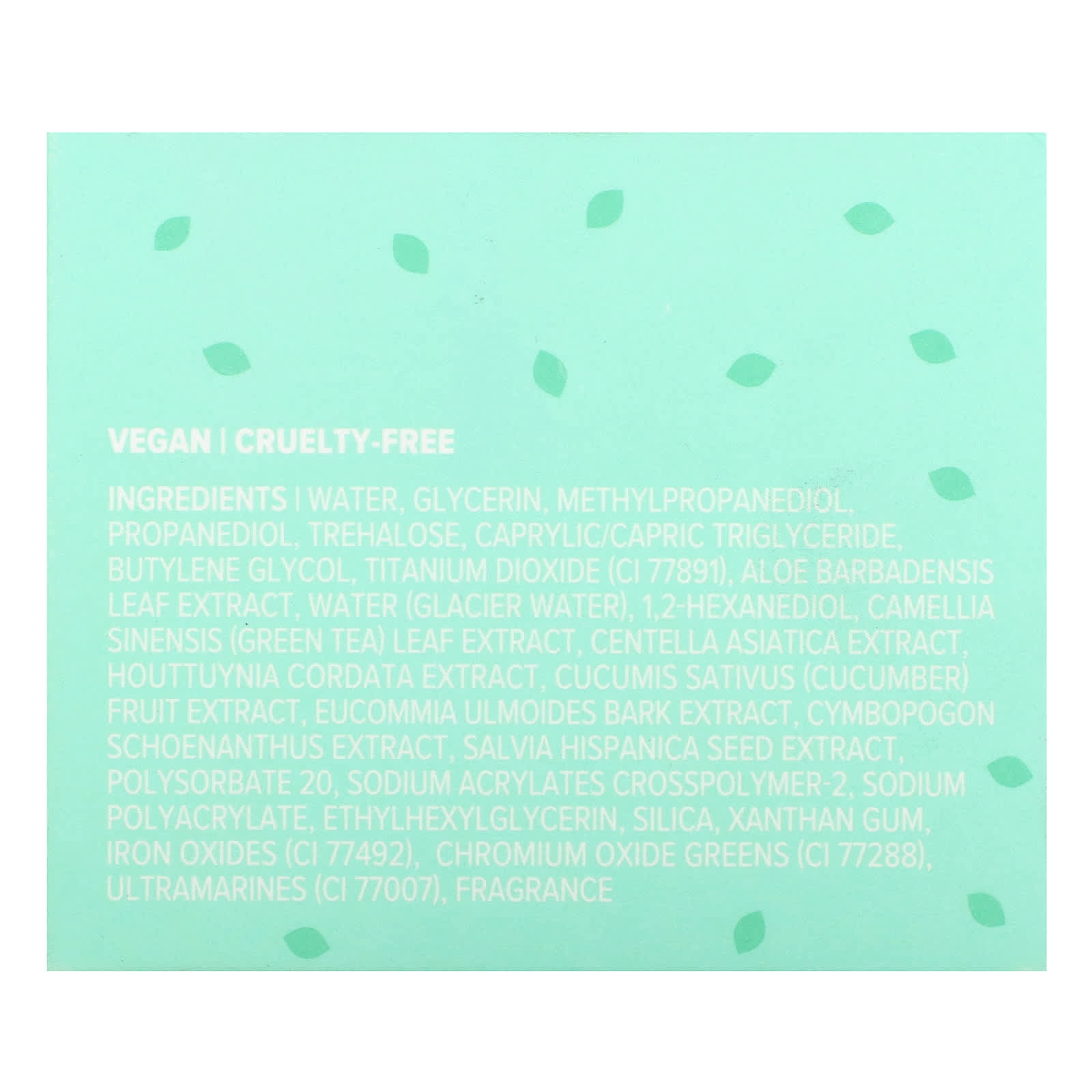 Вода, глицерин, метилпропандиол, пропандиол, трегалоза, каприловый / каприновый триглицерид бутиленгликоль, диоксид титана (CI 77891), экстракт листьев алоэ вера (Aloe barbadensis), ледниковая вода, 1,2-гександиол, экстракт листьев зеленого чая (Camellia sinensis), экстракт центеллы азиатской (Houttuynia cordata), экстракт плодов огурца (Cucumis sativus), экстракт коры Eucommia ulmoides, экстракт верблюжьей травы (Cymbopogon schoenanthus), экстракт семян чиа (Salvia hispanica), полисорбат 20, кроссполимер-2 акрилатов натрия, полиакрилат натрия, этилгексилглицерин, диоксид кремния, ксантановая камедь, оксиды железа (CI 77492), зелень с оксидом хрома (CI 77288). ультрамарины (CI 77007), отдушка.