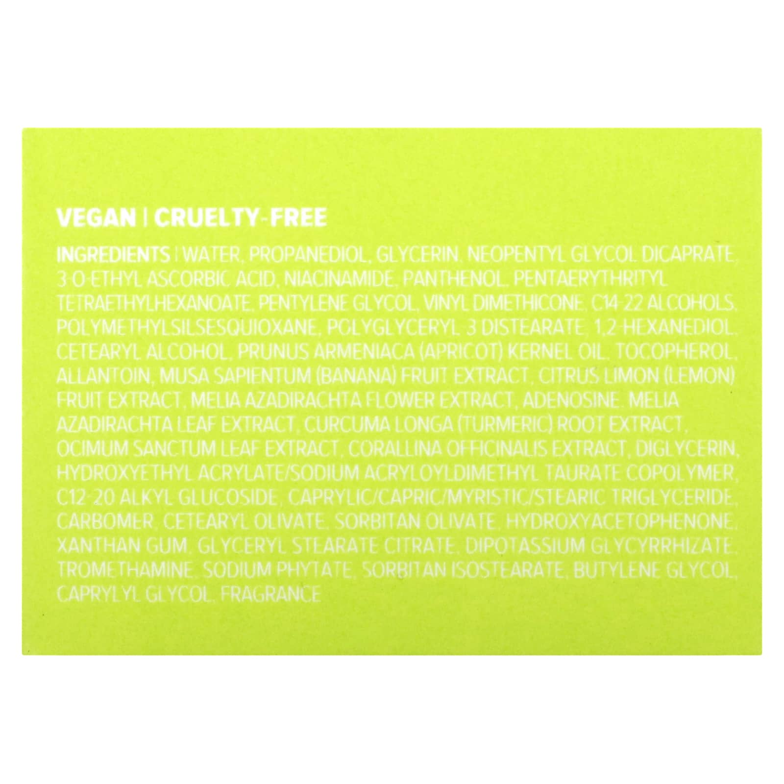 Вода, пропандиол, глицерин, неопентилгликоль дикапрат 30-этил аскорбиновая кислота, никотинамид, пантенол, пентаэритритил тетраэтилгексаноат, пентилен гликоль, винилдиметикон, c14-22 спирты, полиметилсилсесквиоксан, полиглицерил 3 дистеарат 1,2 гександиол цетеариловый спирт, масло из косточек абрикоса (Prunus armeniaca), токоферол, аллантоин, экстракт банана (Musa sapientum), экстракт лимона (Citrus limon), экстракт цветков дерева ним (Melia azadirachta), аденозин, экстракт листьев дерева ним (Melia azadirachta), экстракт корня куркумы (Curcuma longa), экстракт листьев туласи (Ocimum sanctum), экстракт кораллины целебной (Corallina officinalis), диглицерин гидроксиэтилакрилат / натрий акрилоилдиметилтаурат сополимер c12-20 алкил глюкозид, каприловый / каприновый / миристиновый / стеариновый триглицерид карбомер, цетеарил оливат, сорбитан оливат, гидроксиацетофенон, ксантановая камедь, глицерил стеарат цитрат, дикалия глицирризат, трометамин, фитат натрия, сорбитан изостеарат, бутиленгликоль, каприлилгликоль, отдушка.