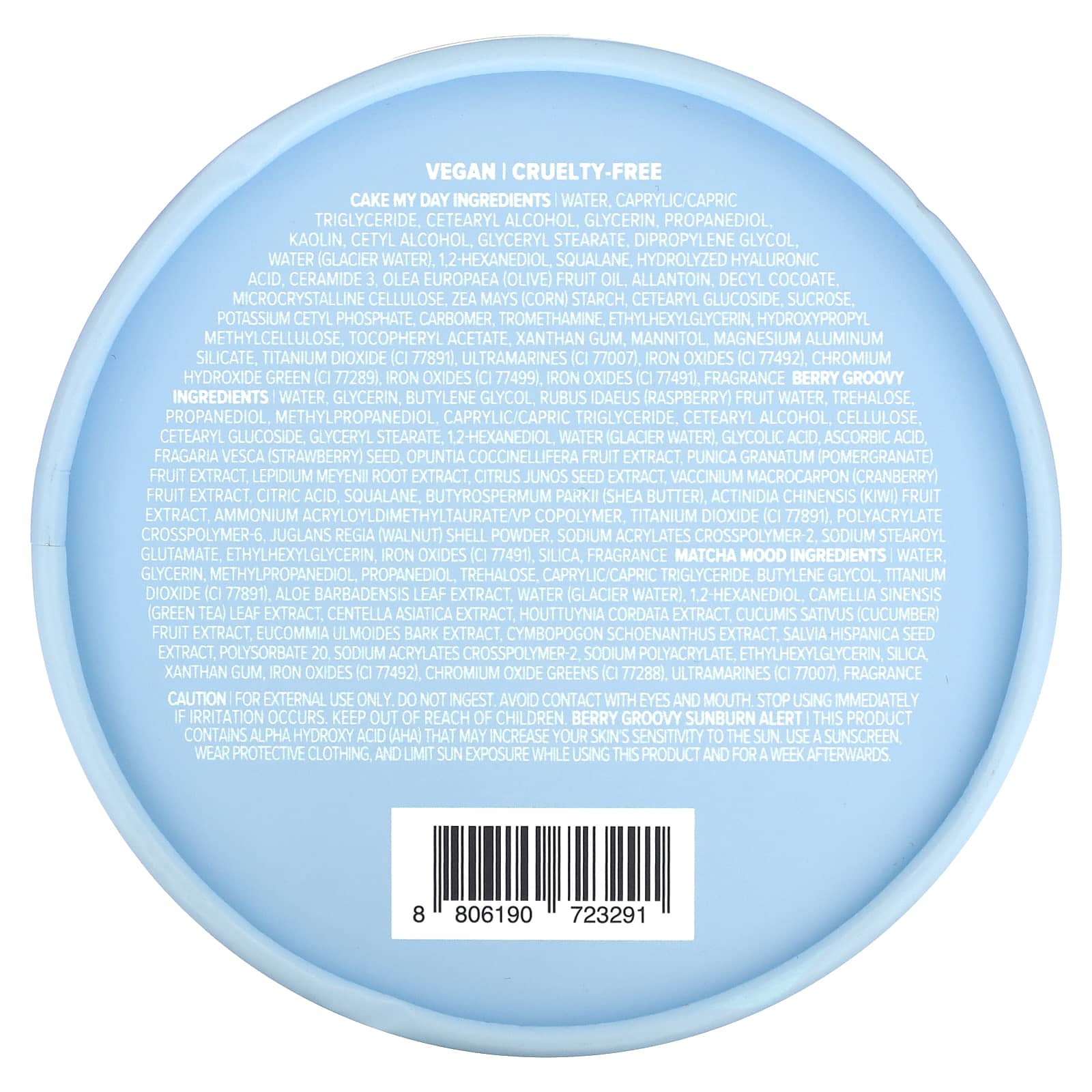 Состав Cake My Day: Вода, каприловый/каприновый триглицерид, цетеариловый спирт, глицерин, пропандиол, каолин, цетиловый спирт, глицерил стеарат, дипропиленгликоль, вода (ледниковая вода), 1,2-гександиол, сквалан, гидролизованная гиалуроновая кислота, керамид 3, оливковое масло (Olea europaea), аллантоин, децилкокоат, микрокристаллическая целлюлоза, кукурузный крахмал (Zea mays), цетеариловый глюкозид, сахароза, цетилфосфат калия, карбомер, трометамин, этилгексилглицерин, гидроксипропилметилцеллюлоза, токоферилацетат, ксантановая камедь, маннит, алюмосиликат магния, диоксид титана (CI 77891), ультрамарины (CI 77007), оксиды железа (CI 77492), гидроксид хрома зеленый (CI 77289), оксиды железа (CI 77499), оксиды железа (CI 77491), отдушка.