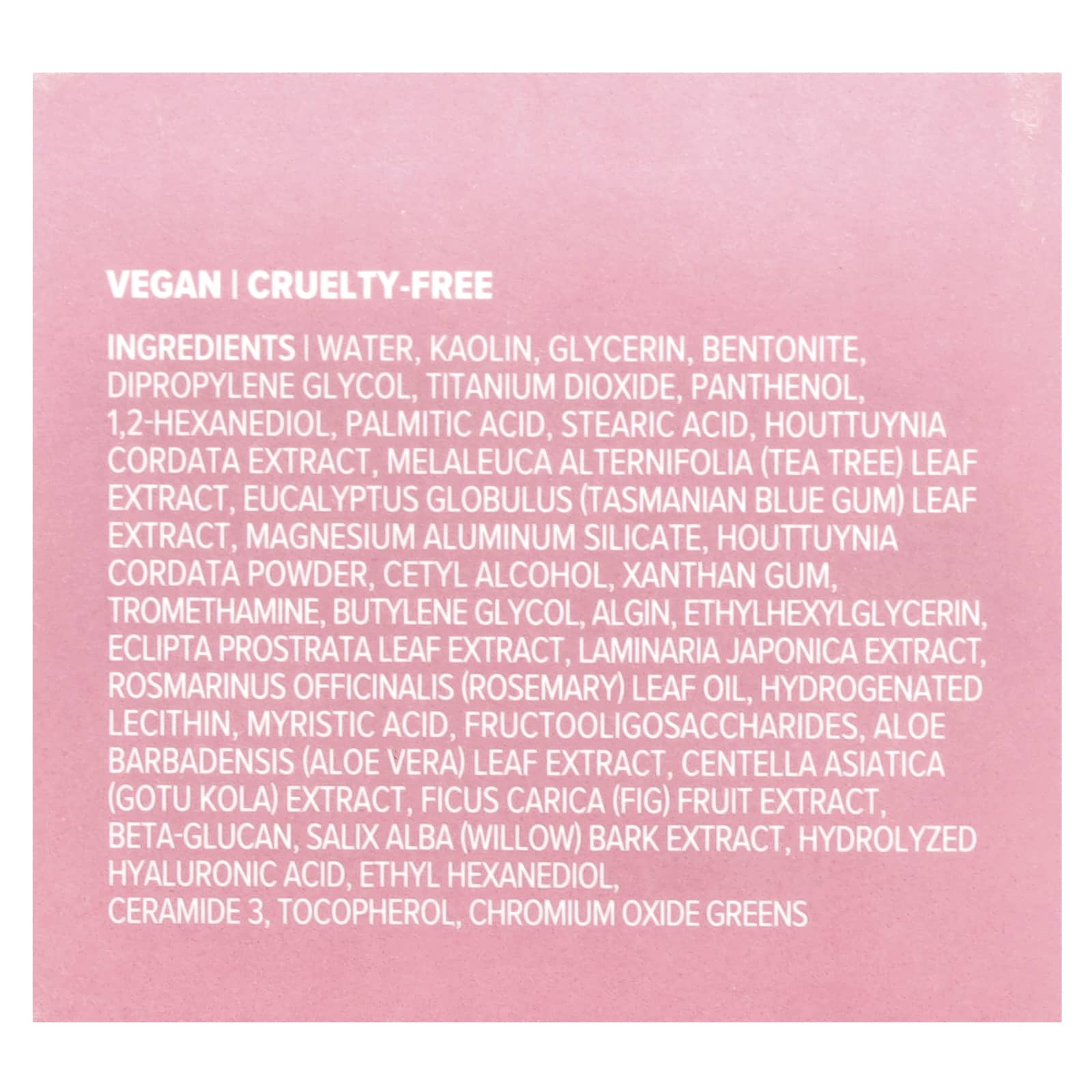 Вода, каолин, глицерин, бентонит, дипропиленгликоль, диоксид титана, пантенол, 1,2-гександиол, пальмитиновая кислота, стеариновая кислота, экстракт хауттюйнии (Houttuynia cordata), экстракт листьев чайного дерева (Melaleuca alternifolia), экстракт листьев эвкалипта шаровидного (Eucalyptus globulus), алюмосиликат магния, порошок из хауттюйнии (Houttuynia cordata), цетиловый спирт, ксантановая камедь, трометамин, бутиленгликоль, алгин, этилгексилглицерин, экстракт листьев эклипты простертой (Eclipta prostrata), экстракт ламинарии японской (Laminaria japonica), масло из листьев розмарина (Rosmarinus officinalis), гидрогенизированный лецитин, миристиновая кислота, фруктоолигосахариды, экстракт листьев алоэ вера (Aloe barbadensis), экстракт готу кола (Centella asiatica), экстракт плодов инжира (Ficus carica), бета-глюкан, экстракт коры ивы (Salix alba), гидролизованная гиалуроновая кислота, этил гександиол, керамид 3, токоферол, хромовая зелень.
