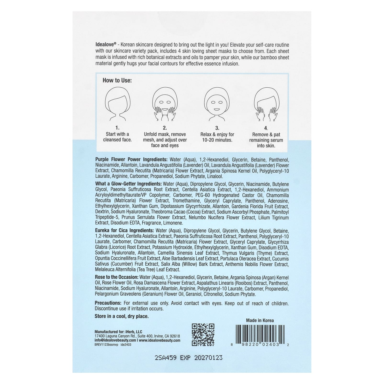 Idealove® — корейская косметика, созданная для сияния вашей кожи! Усовершенствуйте ежедневный уход за собой с помощью нашего набора уходовых средств для кожи, который включает 4 тканевые маски. Каждая тканевая маска содержит насыщенные растительные экстракты и масла, которые заботятся о вашей коже, а наша тканевая основа из бамбука нежно облегает контуры лица, обеспечивая эффективное впитывание эссенции.