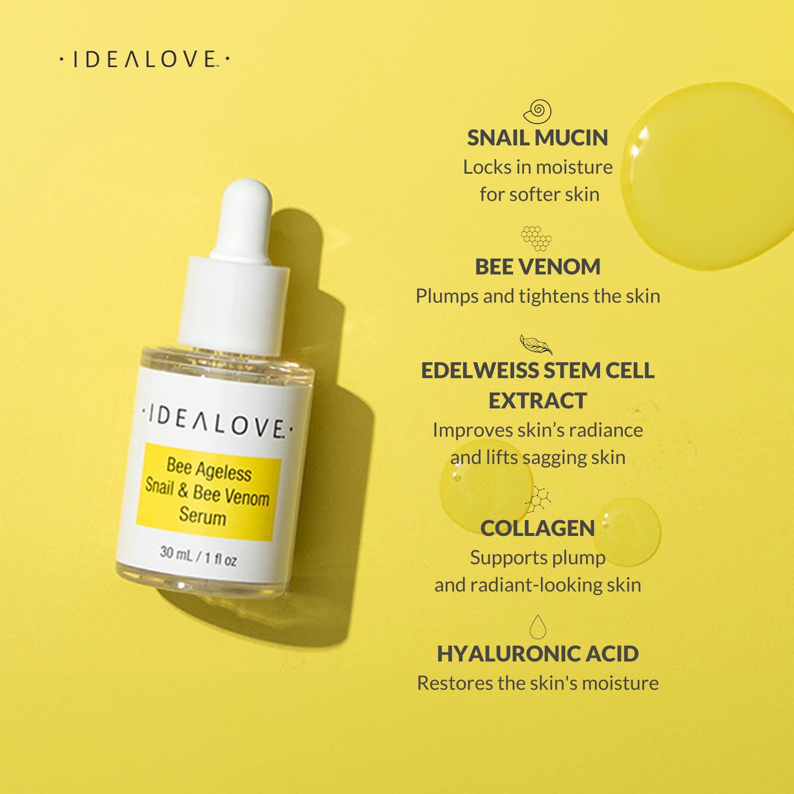 Сохраните красоту на долгие годы благодаря сыворотке с муцином улитки и пчелиным ядом Bee Ageless от Idealove®. Эта питательная многоцелевая сыворотка произвела настоящий фурор. Основные ингредиенты — муцин улитки и пчелиный яд — придают коже сияние и помогают повысить тонус и упругость кожи. Эта невесомая сыворотка, обогащенная экстрактом стволовых клеток, коллагеном и гиалуроновой кислотой, помогает коже выглядеть упругой и сияющей. Каждый ингредиент обладает уникальными преимуществами.