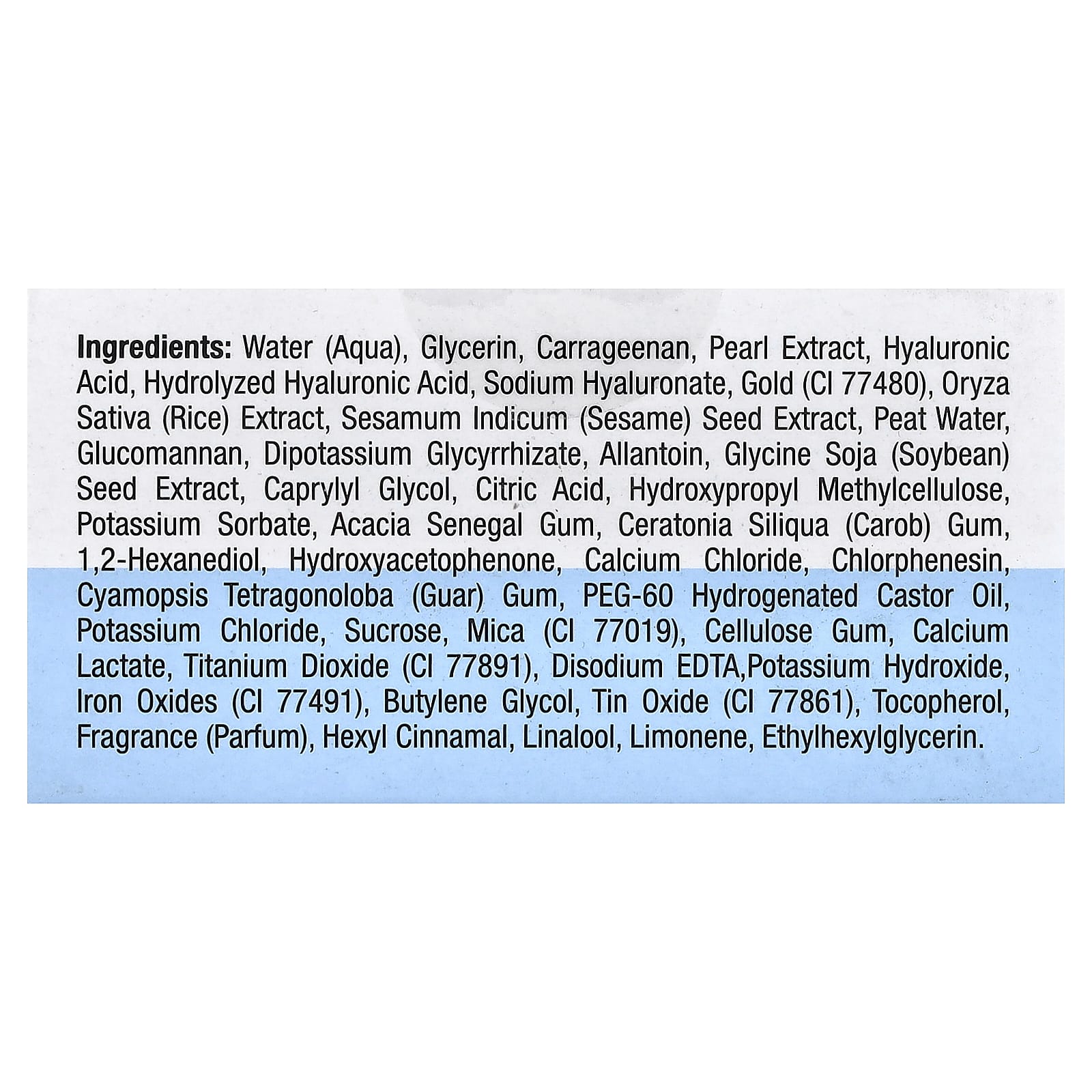 Вода, глицерин, каррагинан, экстракт жемчуга, Гиалуроновая кислота, гидролизованная гиалуроновая кислота, Гиалуронат натрия, золото (CI 77480), экстракт риса (Oryza sativa), экстракт семян кунжута (Sesamum indicum), торфяная вода, глюкоманнан, дикалия глицирризат, аллантоин, экстракт соевых бобов (Glycine soja), каприлилгликоль, лимонная кислота, гидроксипропилметилцеллюлоза, сорбат калия, смола сенегальской акации (Acacia senegal), камедь рожкового дерева (Ceratonia siliqua), 1,2-гександиол, гидроксиацетофенон, хлорид кальция, хлорфенезин, гуаровая камедь (Cyamopsis tetragonoloba), ПЭГ-60 гидрогенизированное касторовое масло, хлорид калия, Сахароза, слюда (CI 77019), целлюлозная камедь, Лактат кальция, диоксид титана (CI 77891), двунатриевая ЭДТК, гидроксид калия, оксиды железа (CI 77491), бутиленгликоль, оксид олова (CI 77861), токоферол, отдушка (парфюмерная композиция), гексил циннамал, линалоол, лимонен, этилгексилглицерин.
