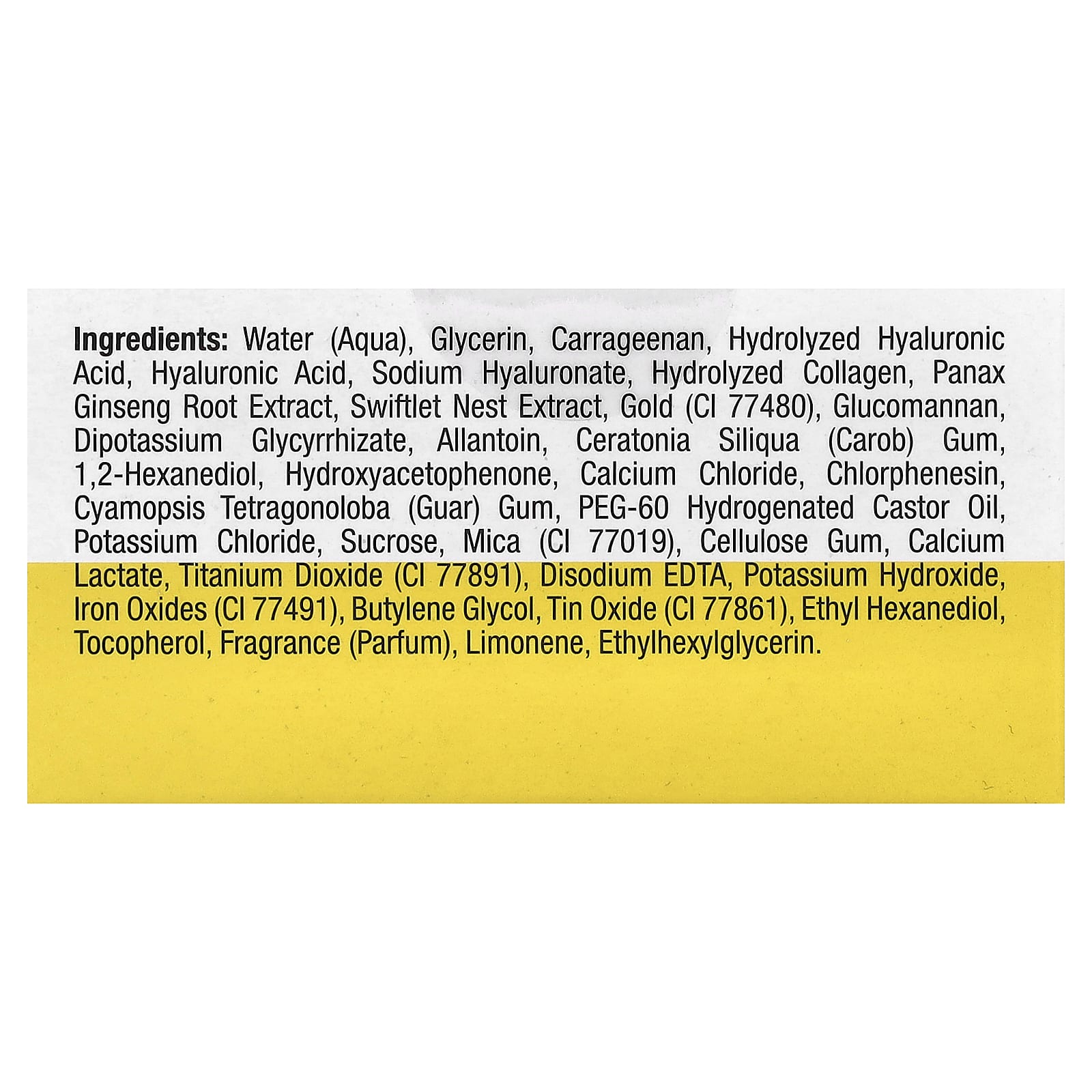 Вода (Aqua), глицерин, каррагинан, гидролизованная гиалуроновая кислота, гиалуроновая кислота, гиалуронат натрия, гидролизованный коллаген, экстракт корня женьшеня (Panax ginseng), экстракт гнезда саланганы, золото (CI 77480), глюкоманнан, дикалия глицирризат, аллантоин, камедь рожкового дерева (Ceratonia siliqua), 1,2-гександиол, гидроксиацетофенон, хлорид кальция, хлорфенезин, гуаровая камедь (Cyamopsis tetragonoloba), ПЭГ-60 гидрогенизированное касторовое масло, хлорид калия, сахароза, слюда (CI 77019), целлюлозная камедь, лактат кальция, диоксид титана (CI 77891), двунатриевая ЭДТК, гидроксид калия, оксиды железа (CI 77491), бутиленгликоль, оксид олова (CI 77861), этил гександиол, токоферол, отдушка (парфюмерная композиция), лимонен, этилгексилглицерин.
