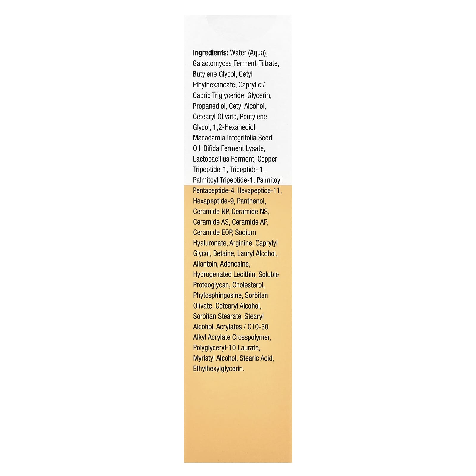 Вода (Aqua), фильтрат фермента галактомицетов, бутиленгликоль, цетилэтилгексаноат, каприловый/каприновый триглицерид, глицерин, пропандиол, цетиловый спирт, цетеарил оливат, пентилен гликоль, 1,2-гександиол, масло макадамии (Macadamia integrifolia), лизат ферментов бифидобактерий, фермент лактобактерий (Lactobacillus), меди трипептид-1, трипептид-1, пальмитоил трипептид-1, пальмитоил пентапептид-4, гексапептид-11, гексапептид-9, пантенол, керамид NP, керамид NS, керамид АС, керамид AP, керамид EOP, гиалуронат натрия, аргинин, каприлилгликоль, бетаин, лауриловый спирт, аллантоин, аденозин, гидрогенизированный лецитин, растворимый протеогликан, холестерин, фитосфингозин, сорбитан оливат, цетеариловый спирт, сорбитан стеарат, стеариловый спирт, акрилат/C10-30 алкил акрилат кроссполимер, полиглицерил-10 лаурат, миристиловый спирт, стеариновая кислота, этилгексилглицерин.