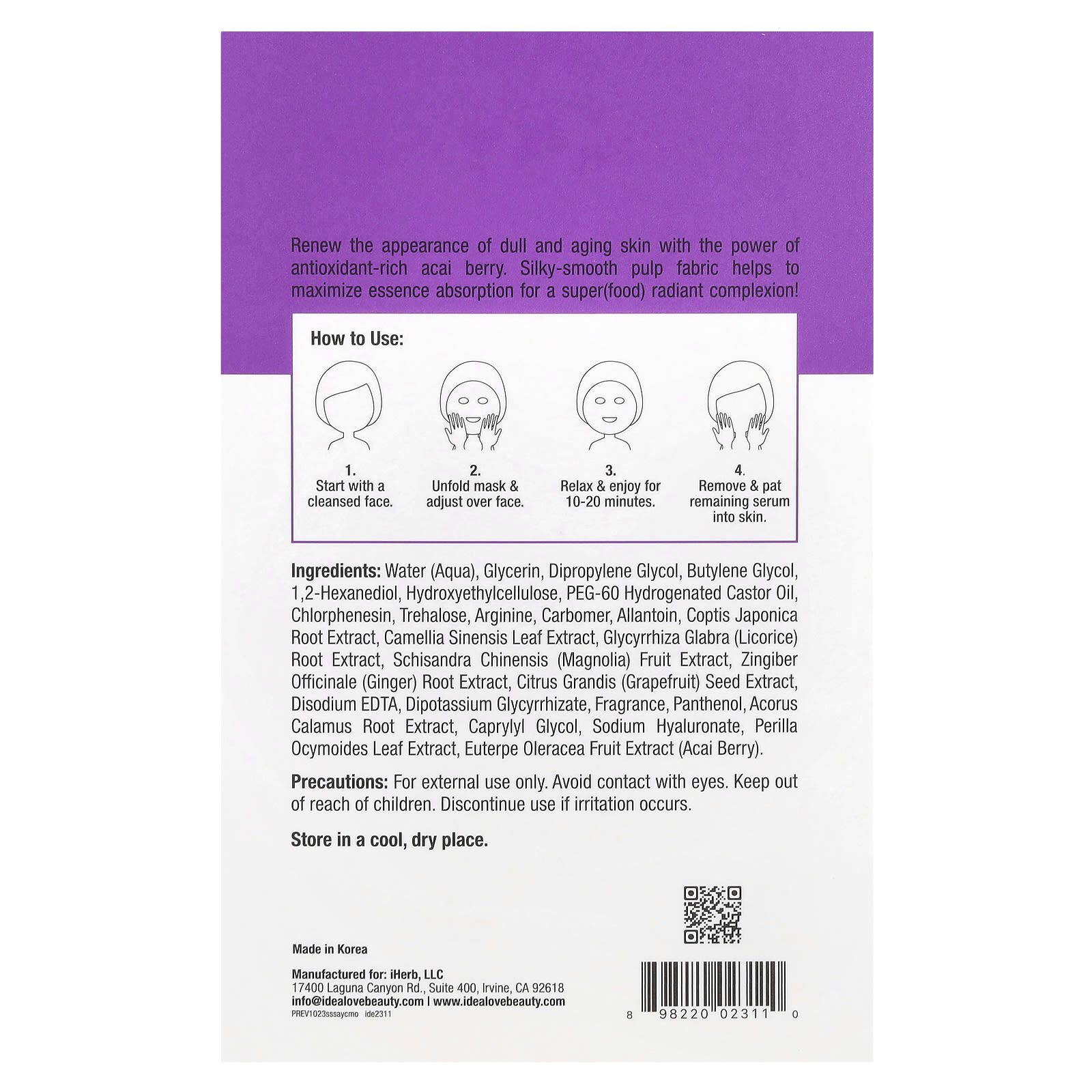 Устройте себе спа в домашних условиях с маской с суперфудами Acai You Checking Me Out (асаи) от Idealove®. Эта тканевая маска с суперфудами освежает тусклую и возрастную кожу благодаря силе ягод асаи, богатых антиоксидантами. Маска, изготовленная из гладкой и шелковистой ткани, помогает максимально впитать эссенцию и обеспечивает сияющий цвет лица благодаря суперфудам!
