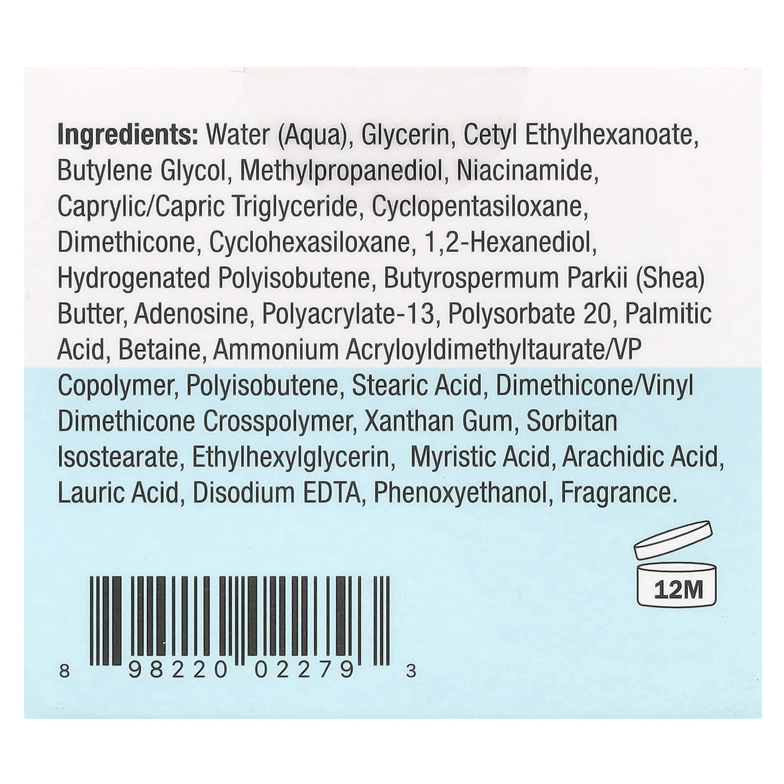 Вода (Aqua), глицерин, цетилэтилгексаноат, бутиленгликоль, Метилпропандиол, Никотинамид, каприловый/каприновый триглицерид, циклопентасилоксан, диметикон, циклогексасилоксан, 1,2-гександиол, Гидрогенизированный полиизобутен, масло ши (Butyrospermum parkii), аденозин, полиакрилат-13, полисорбат 20, Пальмитиновая кислота, Бетаин, Акрилоилдиметилтаурат аммония / сополимер VP, полиизобутен, стеариновая кислота, Диметикон / винилдиметикон кроссполимер, ксантановая камедь, сорбитан изостеарат, этилгексилглицерин, Миристиновая кислота, Арахиновая кислота, Лауриновая кислота, двунатриевая ЭДТК, феноксиэтанол, отдушка.