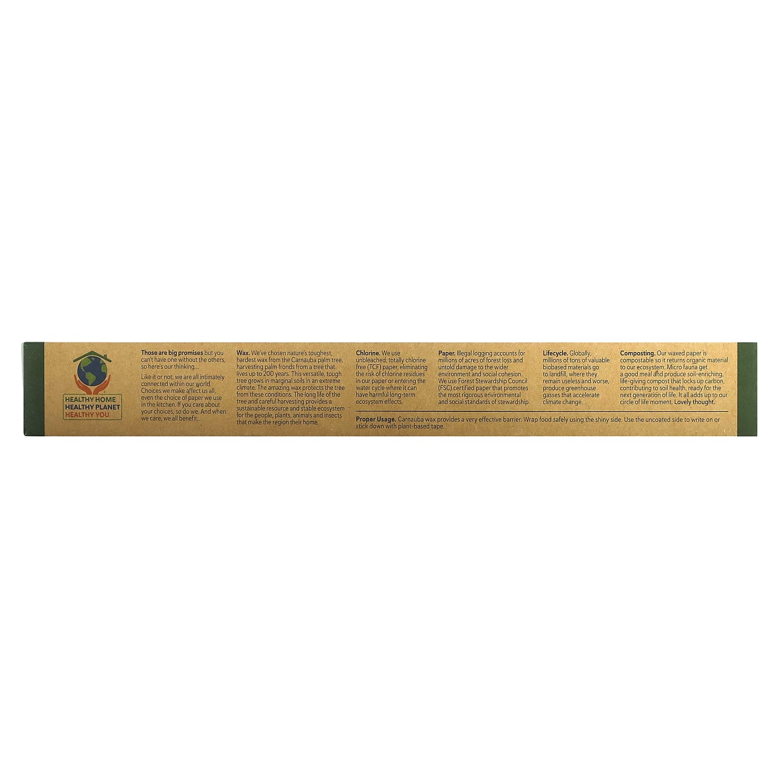 Полностью без хлора (TCF). Не содержит ингредиентов на нефтяной основе Воск из возобновляемых сельскохозяйственных источников Подходит для компостирования