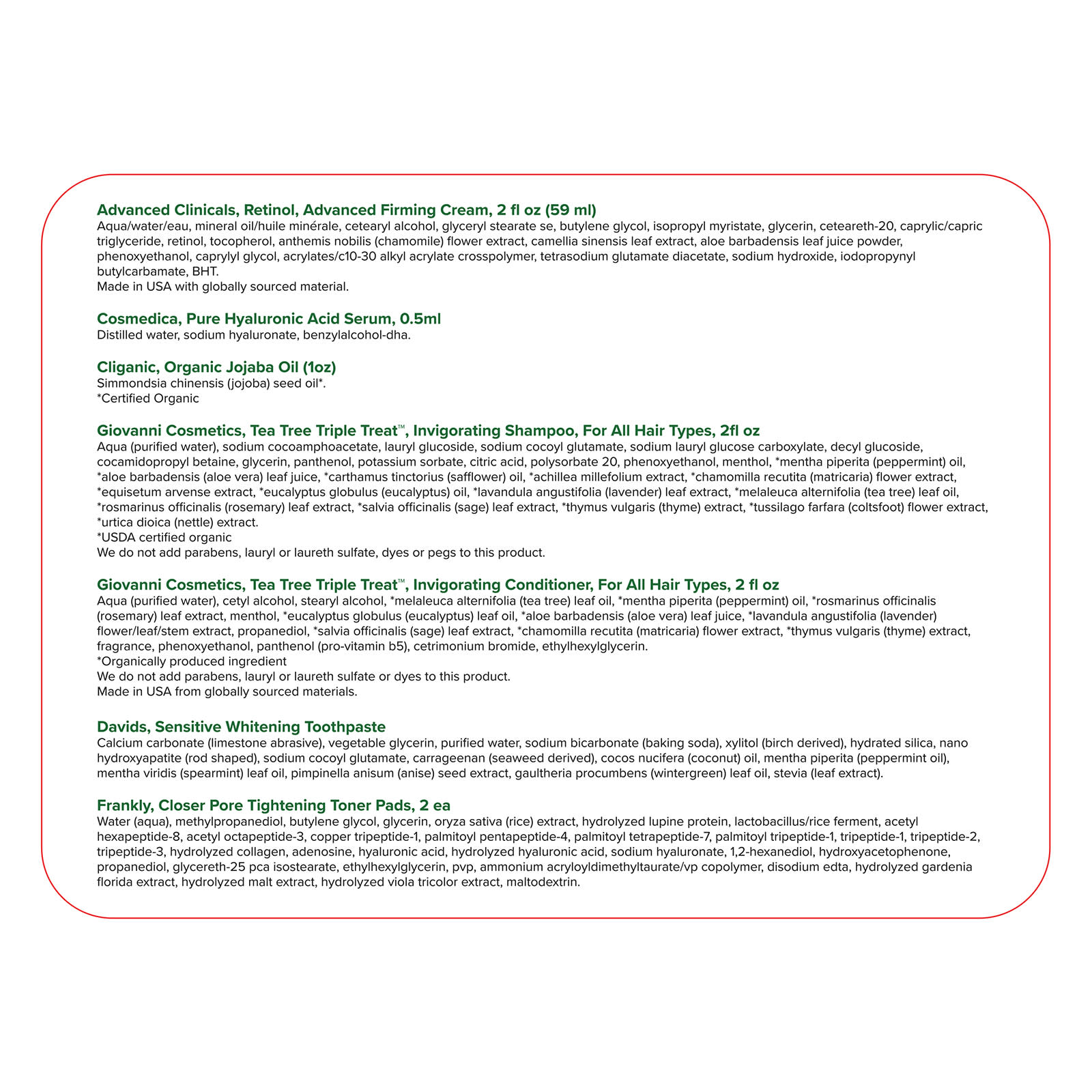 Advanced Clinicals, ретинол, крем, повышающий упругость кожи, с усовершенствованной формулой. Вода, минеральное масло, цетеариловый спирт, глицерил стеарат эмульгирующий, бутиленгликоль, изопропил миристат, глицерин, цетеарет-20, каприловый/каприновый триглицерид, ретинол, токоферол, экстракт цветков ромашки (Anthemis nobilis), экстракт листьев зелёного чая (Camellia sinensis), порошок из сока листьев алоэ вера (Aloe barbadensis), феноксиэтанол, каприлилгликоль, акрилат/c10-30 алкил акрилат кроссполимер, диацетат глутамата тетранатрия, гидроксид натрия, йодопропинил бутилкарбамат, BHT.