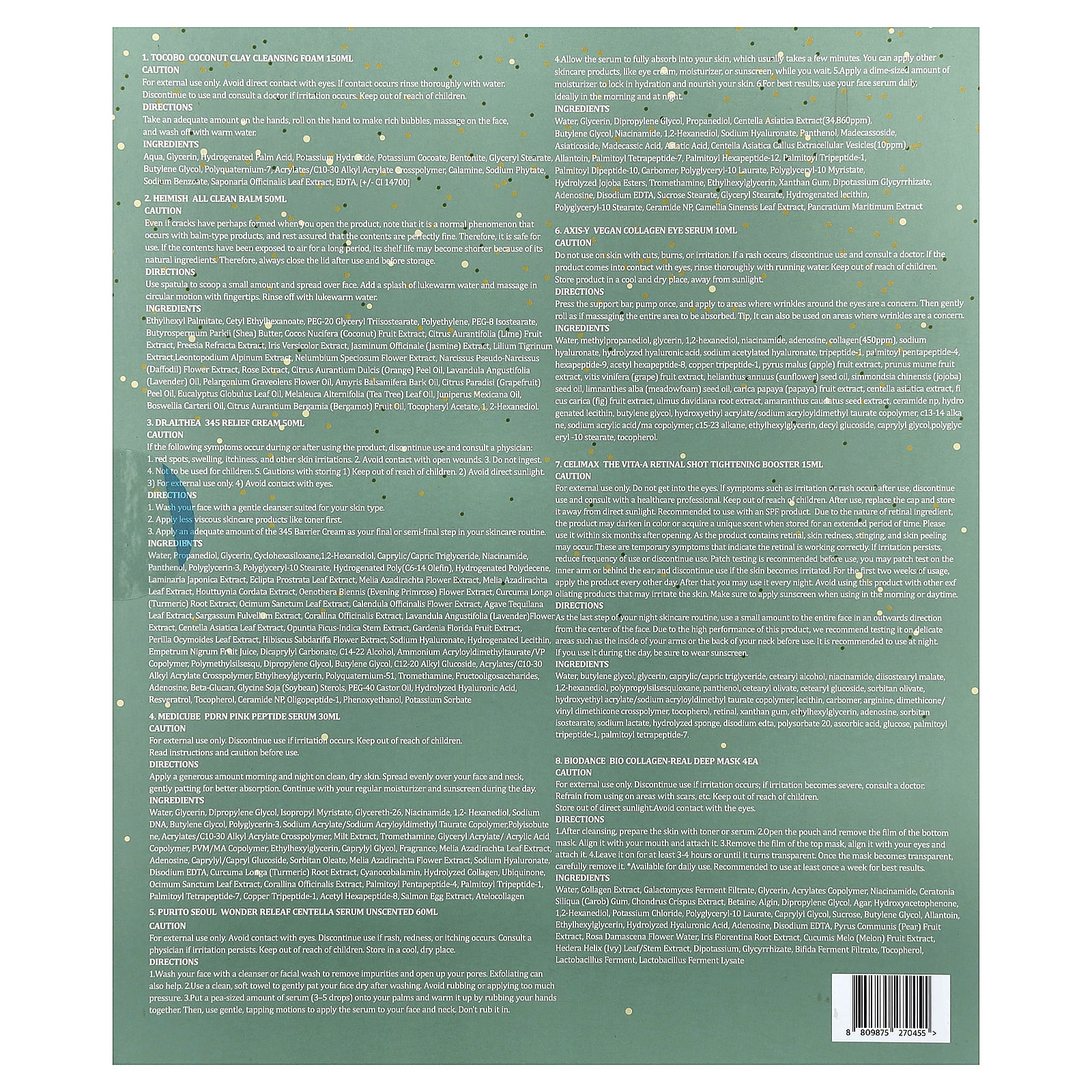 Вода, пропандиол, глицерин, циклогексасилоксан, 1,2-гександиол, каприловый/каприновый триглицерид, никотинамид, пантенол, полиглицерин-3, полиглицерил-10 стеарат, гидрогенизированный поли (C6-14 олефин), гидрогенизированный полидецен, экстракт ламинарии японской (Laminaria japonica), экстракт листьев эклипты простертой (Eclipta prostrata), экстракт цветков дерева ним (Melia azadirachta), экстракт листьев дерева ним (Melia azadirachta), экстракт хауттюйнии (Houttuynia cordata), экстракт цветков примулы вечерней (Oenothera biennis), экстракт корня куркумы (Curcuma longa), экстракт листьев туласи (Ocimum sanctum), экстракт цветков календулы (Calendula officinalis), экстракт листьев голубой агавы (Agave tequilana), экстракт саргассума (Sargassum fulvellum), экстракт кораллины лекарственной (Corallina officinalis), экстракт цветков лаванды (Lavandula angustifolia), экстракт листьев готу колы (Centella asiatica), экстракт стеблей опунции индийской (Opuntia ficus-indica), экстракт плодов гардении жасминовидной (Gardenia florida), экстракт листьев периллы (Perilla ocymoides), экстракт цветков розеллы (Hibiscus sabdariffa), гиалуронат натрия, гидрогенизированный лецитин из сока плодов черного перца (Empetrum nigrum), дикаприлил карбонат, спирт c14-22, аммоний акрилоилдиметилтаурат/ВП сополимер, полиметилсилсес, дипропиленгликоль, бутиленгликоль, c12-20 алкил глюкозид, акрилат/c10-30 алкил акрилат кроссполимер, этилгексилглицерин, поликватерниум-51, трометамин, фруктоолигосахариды, аденозин, бета-глюкан, стеролы сои (Glycine soja), касторовое масло ПЭГ-40, гидролизованная гиалуроновая кислота, ресвератрол, токоферол, керамид NP, олигопептид-1, феноксиэтанол, сорбат калия.