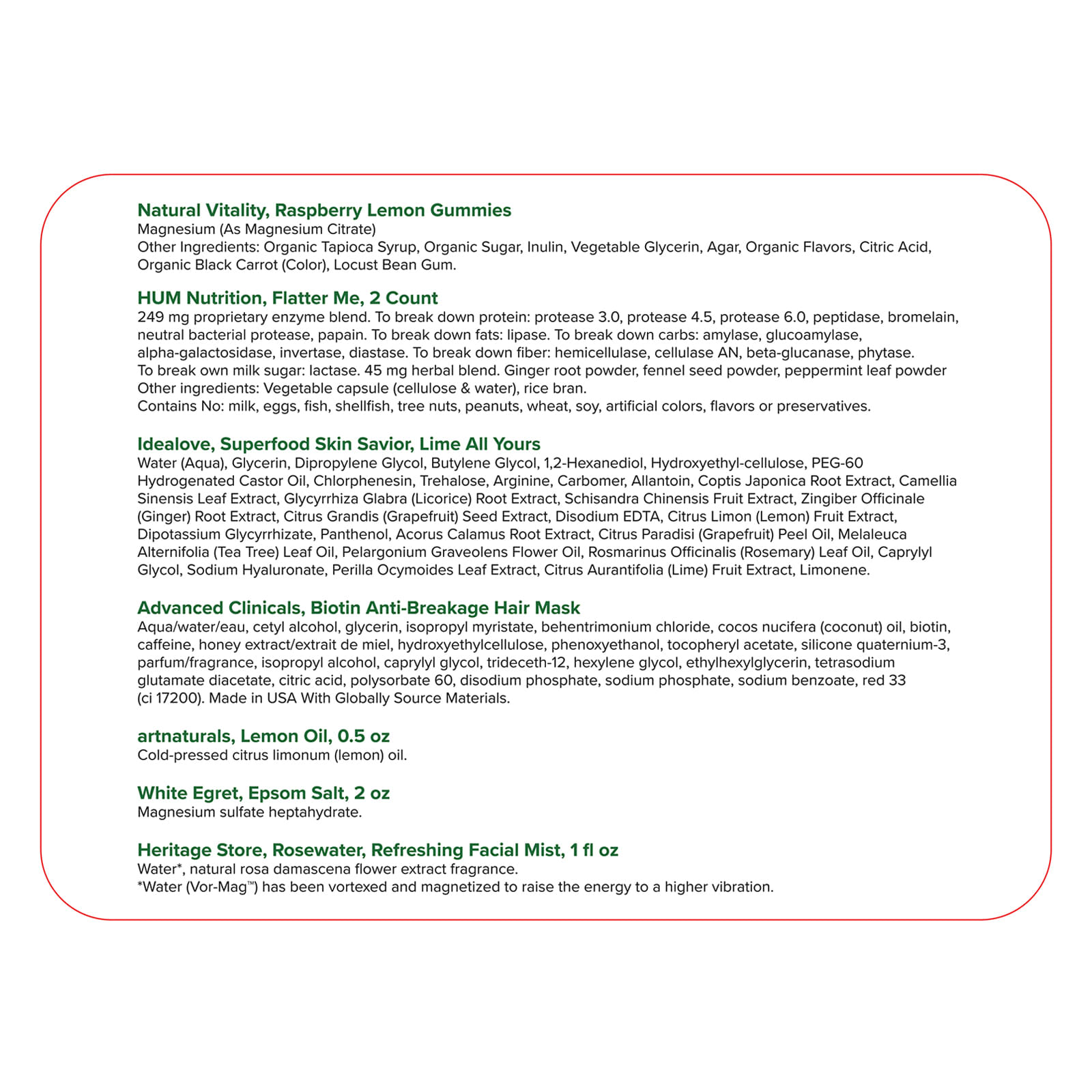 Idealove, маска с суперфудами Superfood Skin Savior, лайм. Вода (Aqua), глицерин, дипропиленгликоль, бутиленгликоль, 1,2-гександиол, Гидроксиэтилцеллюлоза, ПЭГ-60 гидрогенизированное касторовое масло, хлорфенезин, трегалоза, Аргинин, карбомер, аллантоин, экстракт корня коптиса японского (Coptis japonica), экстракт листьев зеленого чая (Camellia sinensis), экстракт корня солодки (Glycyrrhiza glabra), экстракт плодов лимонника (Schisandra chinensis), экстракт корня имбиря (Zingiber officinale), экстракт семян грейпфрута (Citrus grandis), двунатриевая ЭДТК, экстракт лимона (Citrus limon), дикалия глицирризат, пантенол, экстракт корня аира обыкновенного (Acorus calamus), масло из цедры грейпфрута (Citrus paradisi), масло из листьев чайного дерева (Melaleuca alternifolia), масло из цветков герани (Pelargonium graveolens), масло из листьев розмарина (Rosmarinus officinalis), каприлилгликоль, Гиалуронат натрия, экстракт листьев периллы (Perilla frutescens), экстракт плодов лайма (Citrus aurantifolia), лимонен.