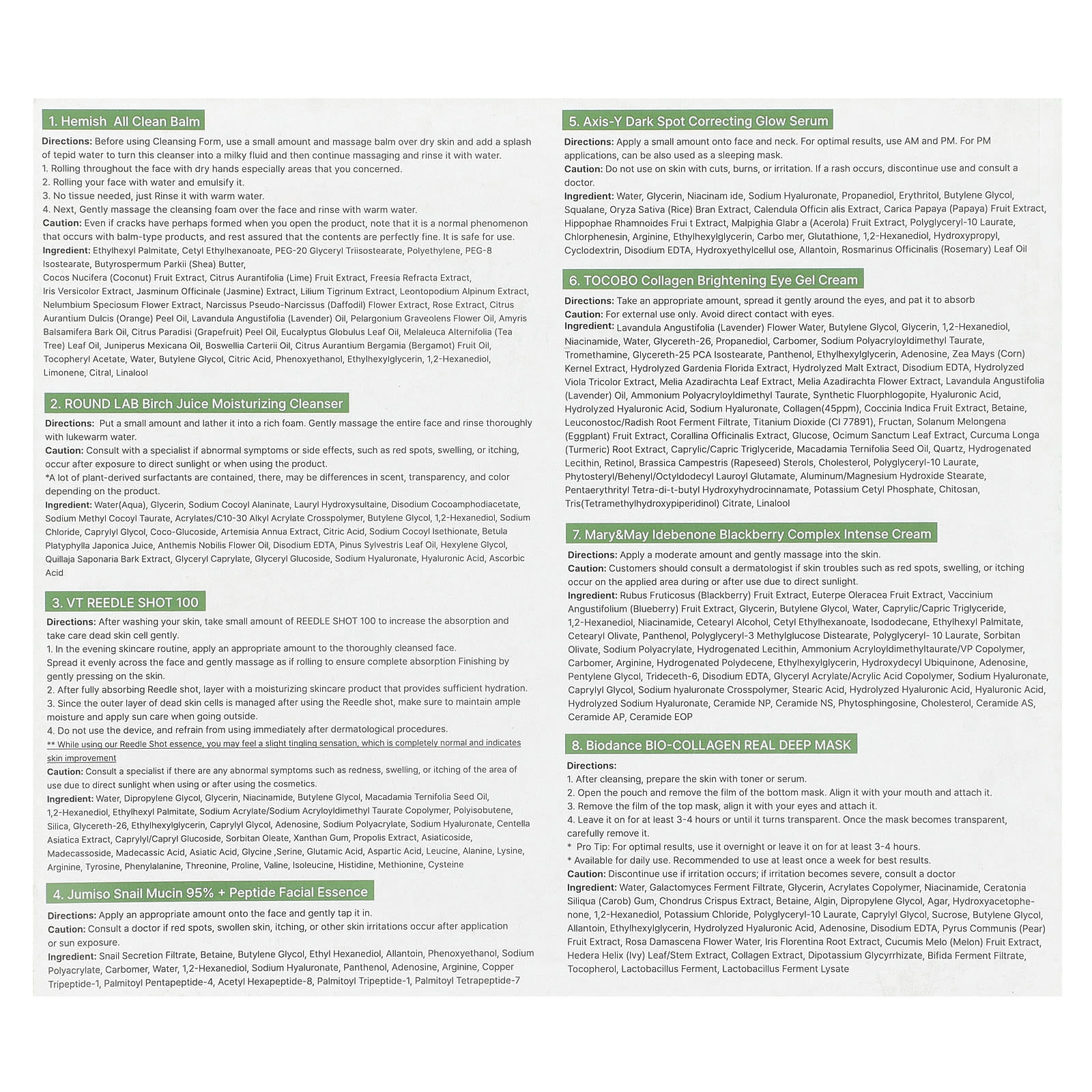 Jumiso Snal Mucin 95% + пептидная эссенция для лица: Фильтрат секрета улитки, бетаин, бутиленгликоль, этил гександиол, аллантоин, феноксиэтанол, полиакрилат натрия, карбомер, вода, 1,2-гександиол, гиалуронат натрия, пантенол, аденозин, аргинин, меди трипептид-1, пальмитоил пентапептид-4, ацетил гексапептид-8, пальмитоил трипептид-1, пальмитоил тетрапептид-7.