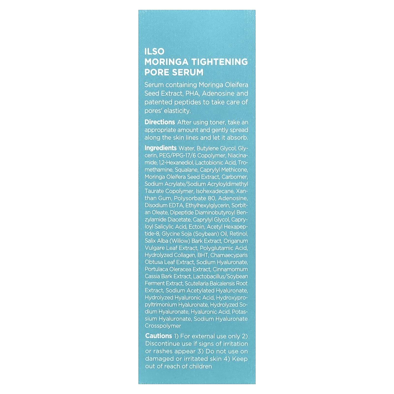 Вода, бутиленгликоль, глицерин, ПЭГ/ППГ-17/6 сополимер, никотинамид, 1,2-гександиол, лактобионовая кислота, трометамин, сквалан, каприлил метикон, экстракт семян моринги (Moringa oleifera), карбомер, натрий акрилат/натрий акрилоилдиметилтаурат сополимер, изогексадекан, ксантановая камедь, полисорбат 80, аденозин, двунатриевая ЭДТК, этилгексилглицерин, сорбитанолеат, дипептид диаминобутироил бензиламид диацетат, каприлилгликоль, каприлоил салициловой кислоты, эктоин, ацетил гексапептид-8, соевое масло (Glycine soja), ретинол, экстракт коры ивы (Salix alba), экстракт листьев орегано (Origanum vulgare), полиглутаминовая кислота, гидролизованный коллаген, бутилгидрокситолуол, экстракт листьев кипарисовика (Chamaecyparis obtusa), гиалуронат натрия, экстракт портулака огородного (Portulaca oleracea), экстракт коры кассии (Cinnamomum cassia), лактобактерии (Lactobacillus) /ферментированный экстракт соевых бобов, экстракт корня шлемника (Scutellaria baicalensis), ацетилированный гиалуронат натрия, гидролизованная гиалуроновая кислота, гиалуронат гидроксипропилтримония, гидролизованный гиалуронат натрия, гиалуроновая кислота, гиалуронат калия, гиалуронат натрия кроссполимер.