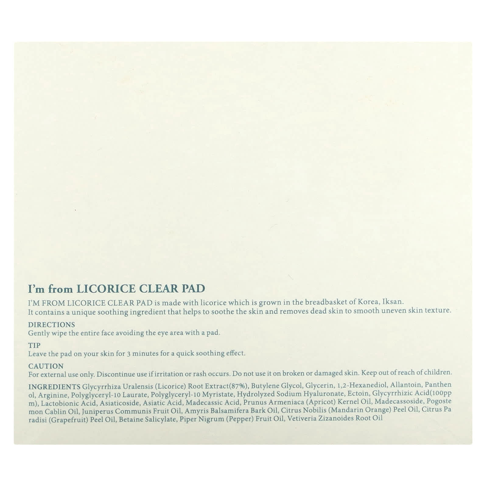 I'm from LICORICE CLEAR PAD I'm from LICORICE CLEAR PAD производится из солодки, которая выращивается в корейском городе Иксан. Он содержит уникальный успокаивающий ингредиент, который помогает успокоить кожу и удаляет омертвевшие клетки, выравнивая неровности кожи.