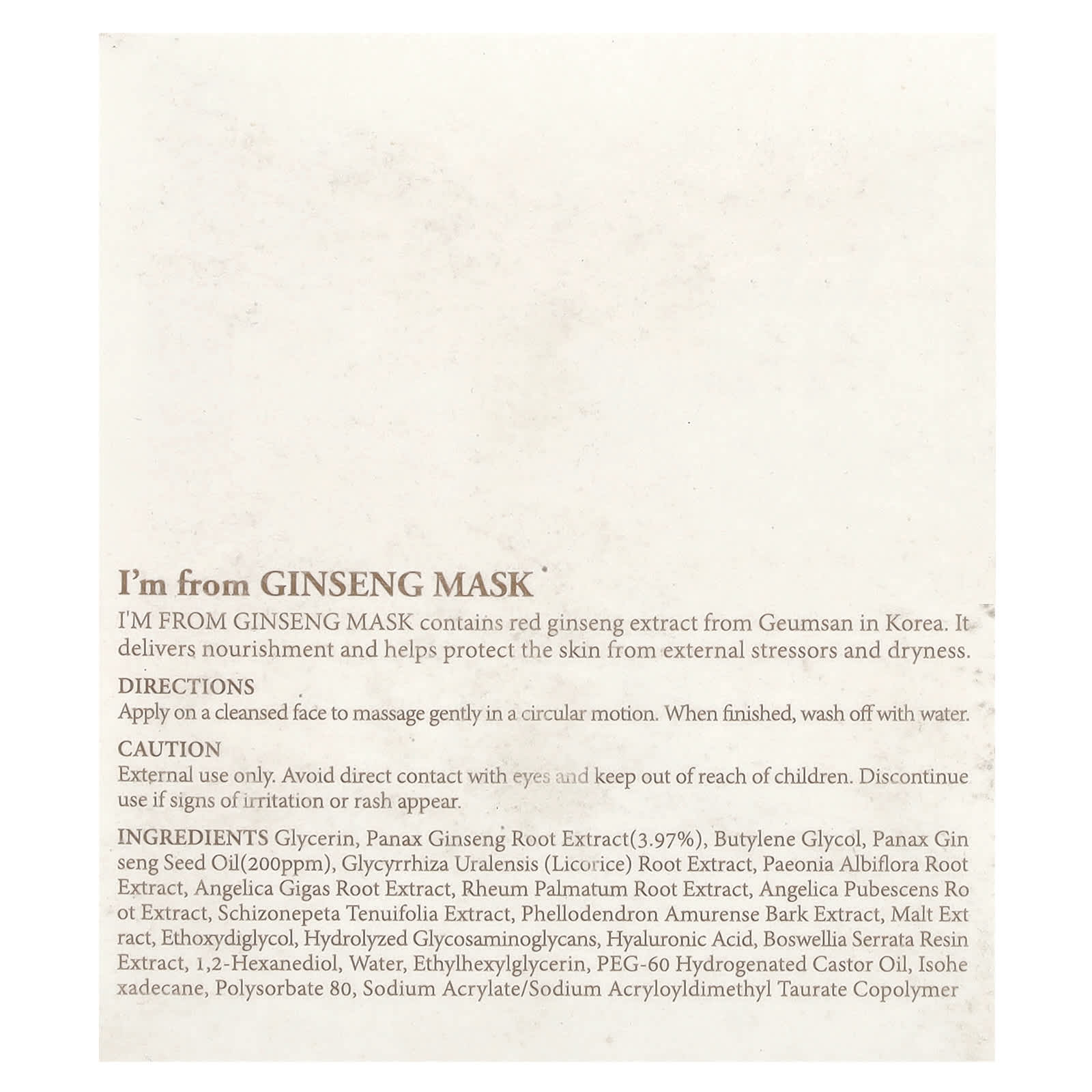 Глицерин, экстракт красного женьшеня (3,97%), бутиленгликоль, масло семян женьшеня обыкновенного (Panax ginseng) (200 част./млн), экстракт корня солодки уральской (Glycyrrhiza uralensis), экстракт корня пиона молочноцветкового (Paeonia albiflora), экстракт корня дудника гигантского (Angelica gigas), экстракт корня ревеня (Rheum palmatum), экстракт корня дягиля (Angelica pubescens), экстракт схизонепеты тонколистной (Schizonepeta tenuifolia), экстракт коры амурского бархата (Phellodendron amurense), экстракт солода, этоксидигликоль, гидролизованные гликозаминогликаны, гиалуроновая кислота, экстракт камеди босвеллии (Boswellia serrata), 1,2-гександиол, вода, этилгексилглицерин, ПЭГ-60 гидрогенизированное касторовое масло, изогексадекан, полисорбат 80, натрия акрилат/натрия акрилоилдиметил таурат сополимер, отдушка.