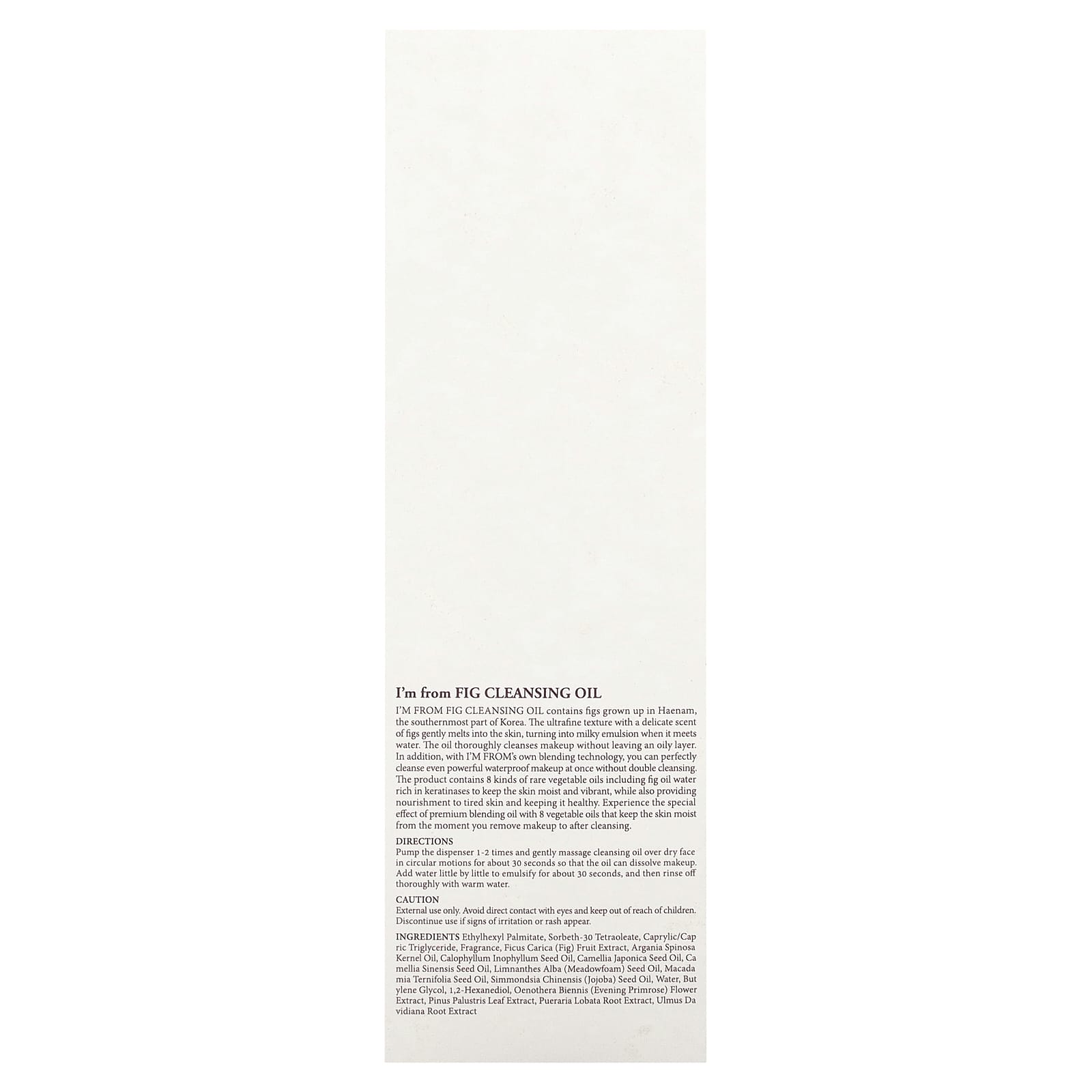 Очищающее масло I'm from Fig содержит экстракт инжира, выращенный в Ханаме, самой южной части Кореи. Средство имеет ультратонкую текстуру с нежным ароматом инжира, которое мягко тает на коже, превращаясь в молочную эмульсию при попадании в воду. Масло тщательно смывает макияж, не оставляя жирного слоя. Кроме того, с помощью собственной технологии смешивания I'M FROM вы можете идеально смывать даже стойкий водостойкий макияж без двойного очищения. Продукт содержит 8 видов редких растительных масел, включая воду из инжирного масла, богатую кератиназой, которая сохраняет кожу увлажненной и сияющей, а также обеспечивает питание для уставшей кожи и сохраняет ее здоровье. Попробуйте особый эффект масла премиального качества с 8 растительными маслами, которые сохраняют кожу увлажненной с момента снятия макияжа и до момента очищения.