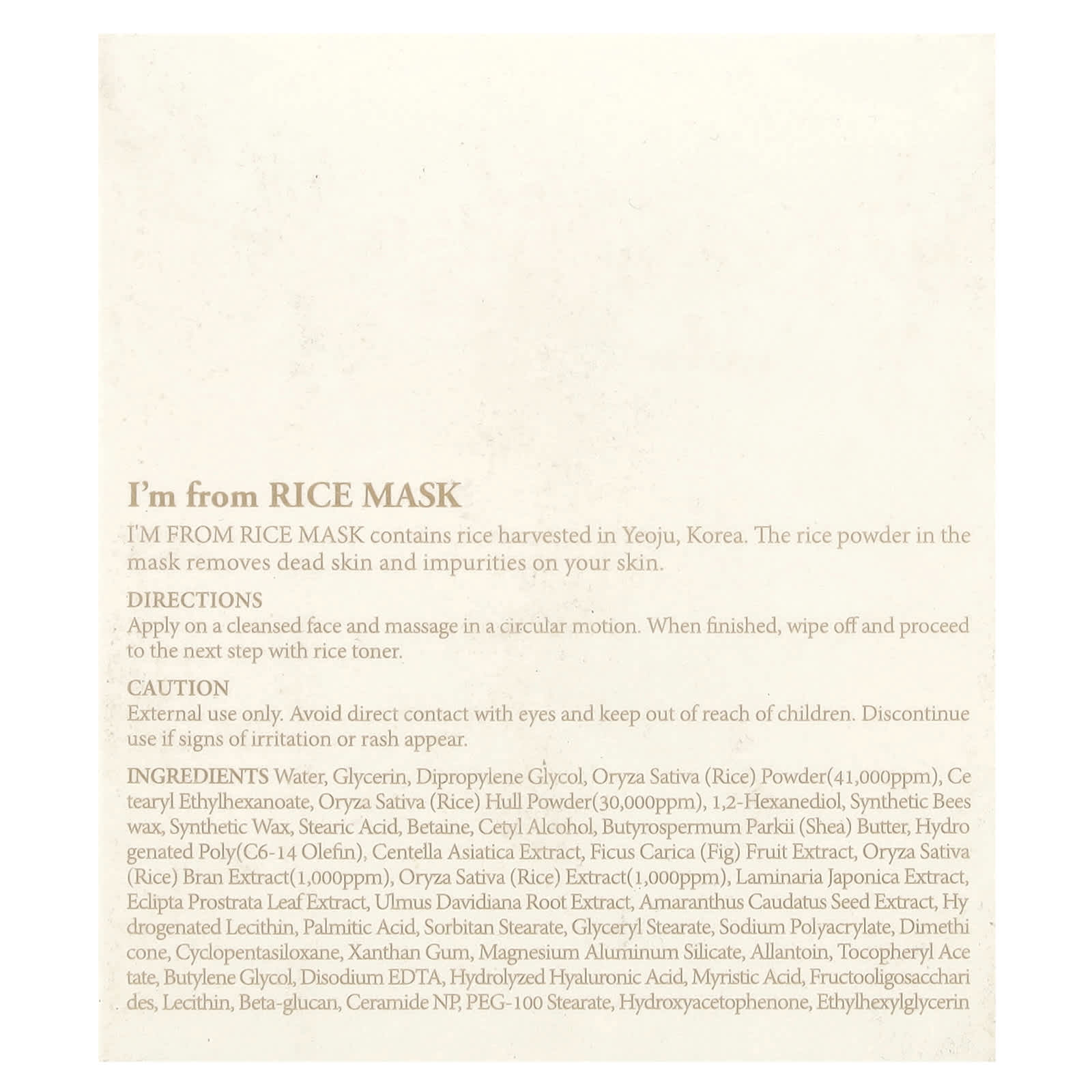 Вода, глицерин, дипропиленгликоль, ориза сатива (рисовый порошок) (41 000 част. / млн), цетеариловый этилгексаноат, порошок из шелухи риса (Oryza sativa) (30 000 част. / млн), 1,2-гександиол, синтетический воск, синтетический воск, стеариновая кислота, бетаин, цетиловый спирт, масло ши (Butyrospermum parkii), гидрогенизированный поли(c6-14 олефин), экстракт готу колы (Centella asiatica), экстракт плодов инжира (Ficus carica), экстракт рисовых отрубей (Oryza sativa) (1000 част. / млн), экстракт риса (Oryza sativa) (1000 част. / млн), экстракт ламинарии японской (Laminaria japonica), экстракт листьев эклипты простертой (Eclipta prostrata), экстракт корня вяза Давида (Ulmus davidiana), экстракт семян амаранта хвостатого (Amaranthus caudatus), гидрогенизированный лецитин, пальмитиновую кислоту, сорбитан стеарат, глицерил стеарат, полиакрилат натрия, диметикон, циклопентасилоксан, ксантановая камедь, алюмосиликат магния, аллантоин, токоферилацетат, бутиленгликоль, двунатриевая ЭДТК, гидролизованная гиалуроновая кислота, миристиновая кислота, фруктоолигосахариды, лецитин, бета-глюкан, керамид NP, ПЭГ-100 стеарат, гидроксиацетофенон, этилгексилглицерин.