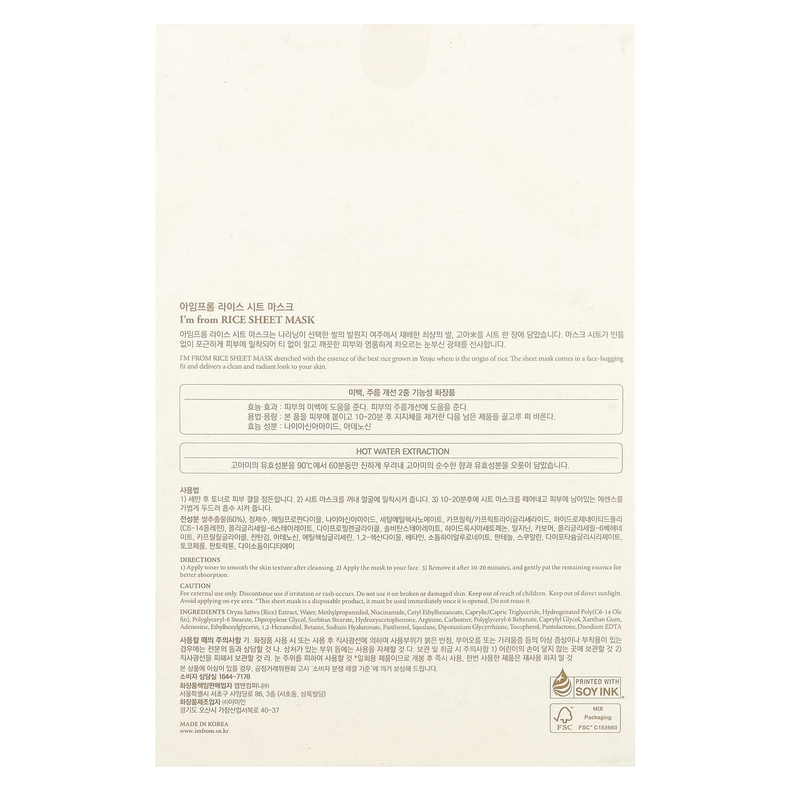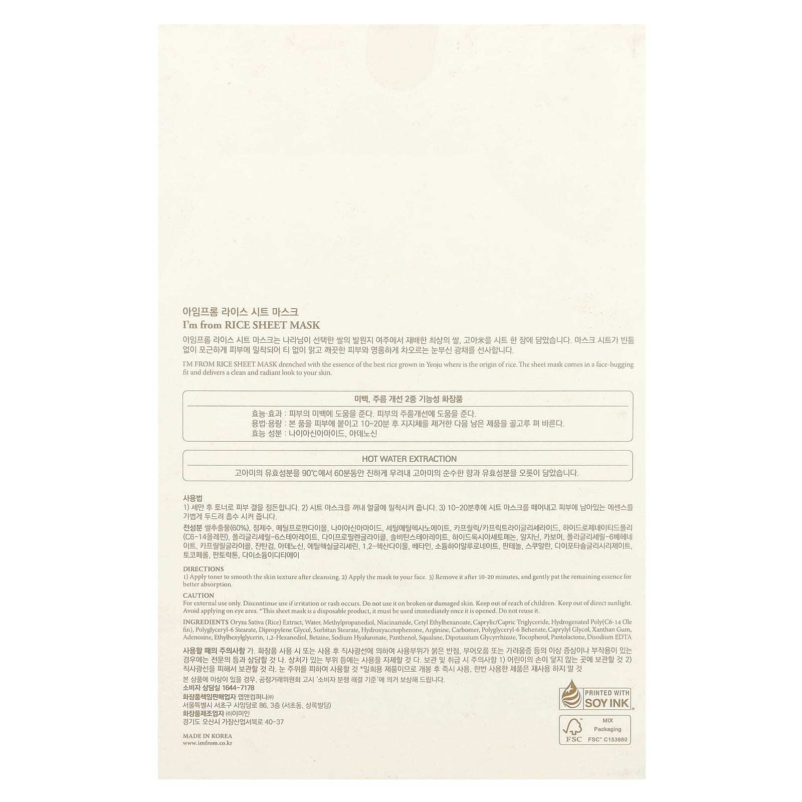 Тканевая маска I'm From Rice пропитана эссенцией лучшего риса, выращенного в Йоджу, где он был создан. Тканевая маска плотно облегает лицо и придает коже чистый и сияющий вид.