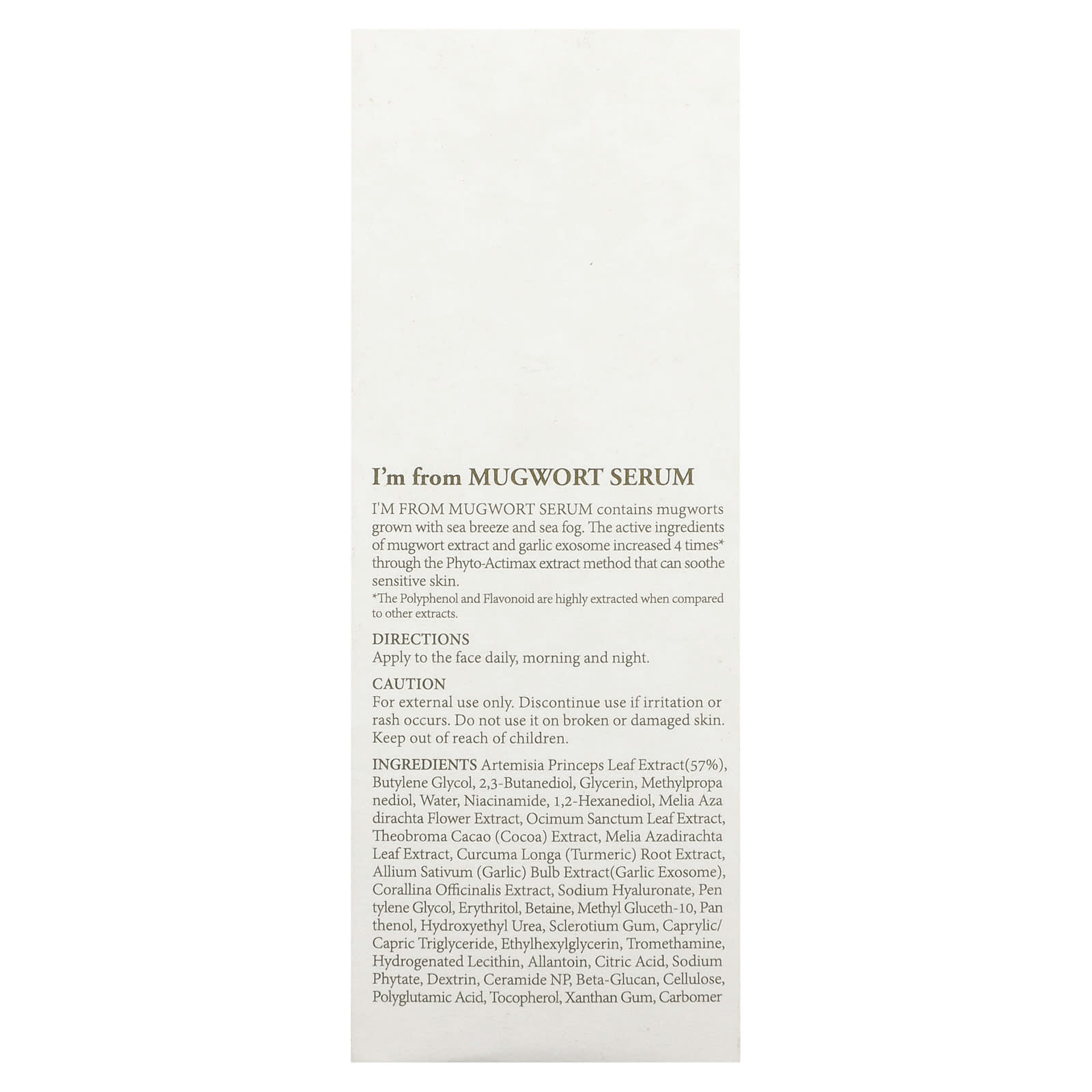 Сыворотка I'm из полыни содержит полынь, выращенную с помощью морского бриза и морского тумана. Количество активных ингредиентов экстракта полыни и экстракта чеснока увеличено в 4 раза* благодаря методу экстракта Phyto-Actimax, который успокаивает чувствительную кожу.