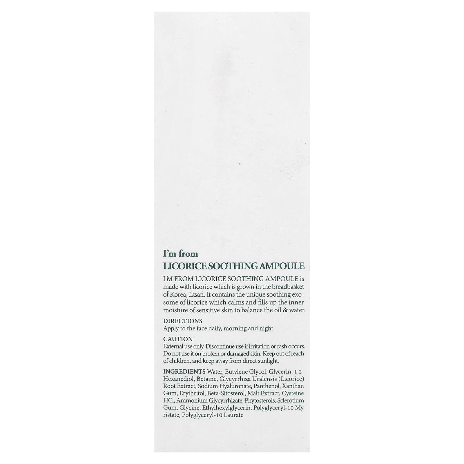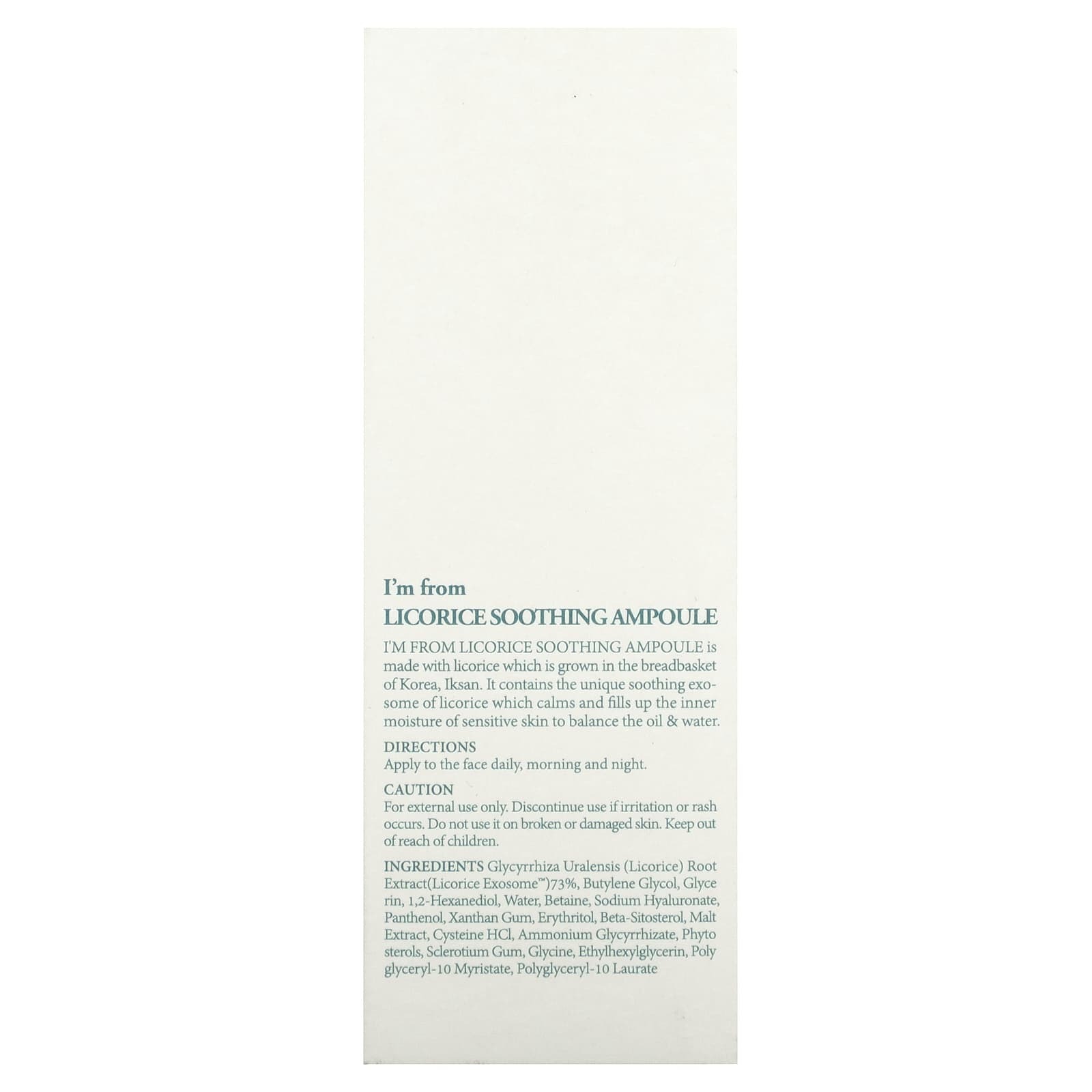 I'm from Licorice Soothing Ampoule производится из солодки, выращенной в корейском городе Иксан. Он содержит уникальные успокаивающие экзосомы солодки, которые успокаивают и наполняют внутреннюю влагу чувствительной кожи, чтобы сбалансировать жир и воду.