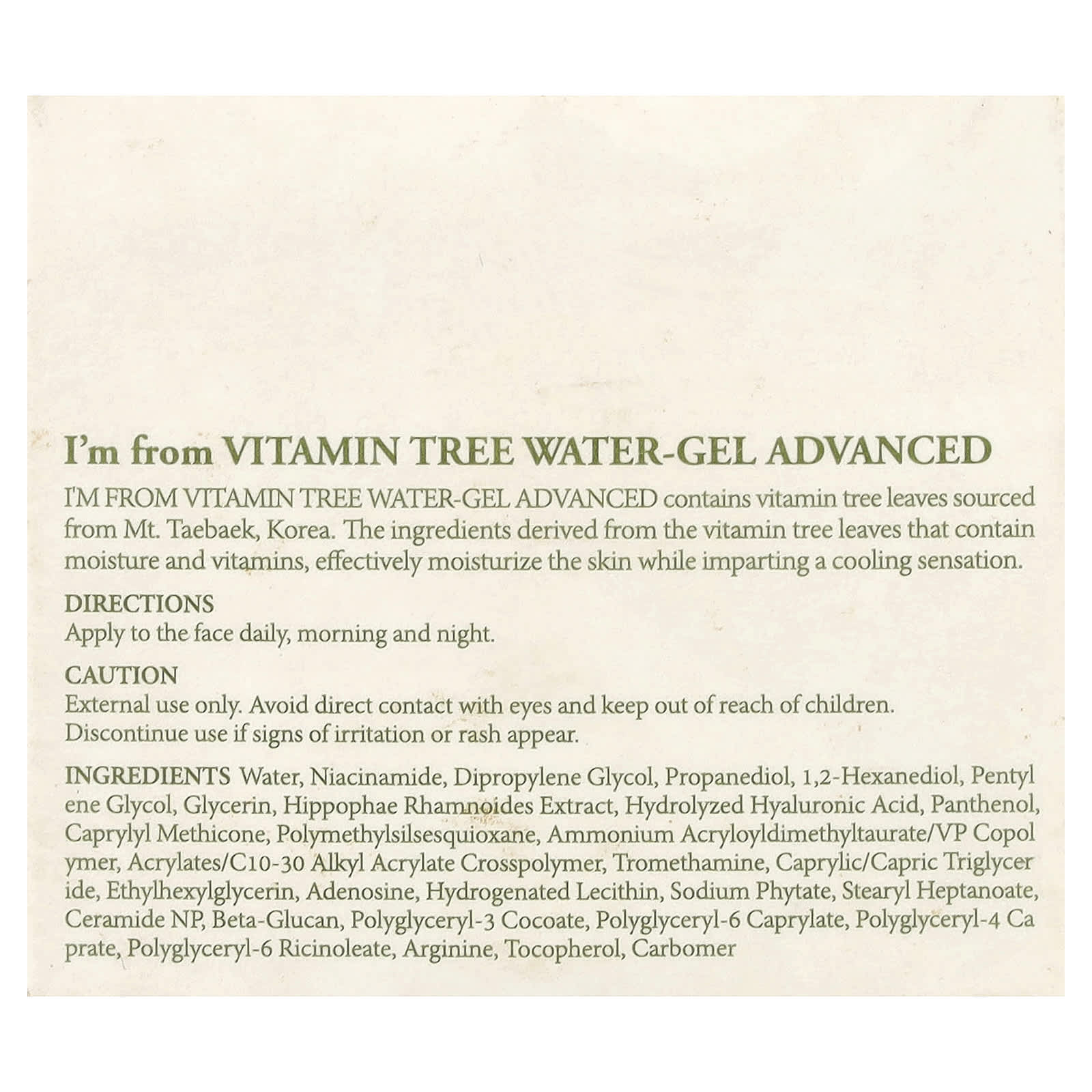Гель-гель I'm From Vitamin Tree Water-Gel Advanced содержит листья витаминного дерева, выращенные на ферме Mt. Тхэбэк, Корея. Ингредиенты, полученные из листьев витаминного дерева, содержащие влагу и витамины, эффективно увлажняют кожу, придавая ей ощущение прохлады.