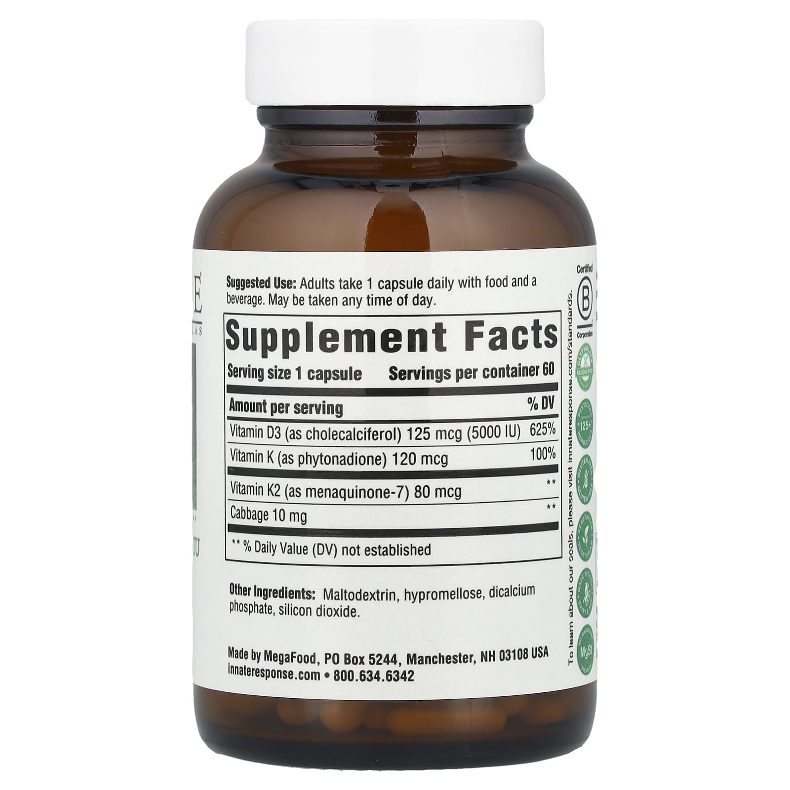 | Витамин D3 (в виде холекальциферола) | 125 мкг (5000 МЕ) | 625% |