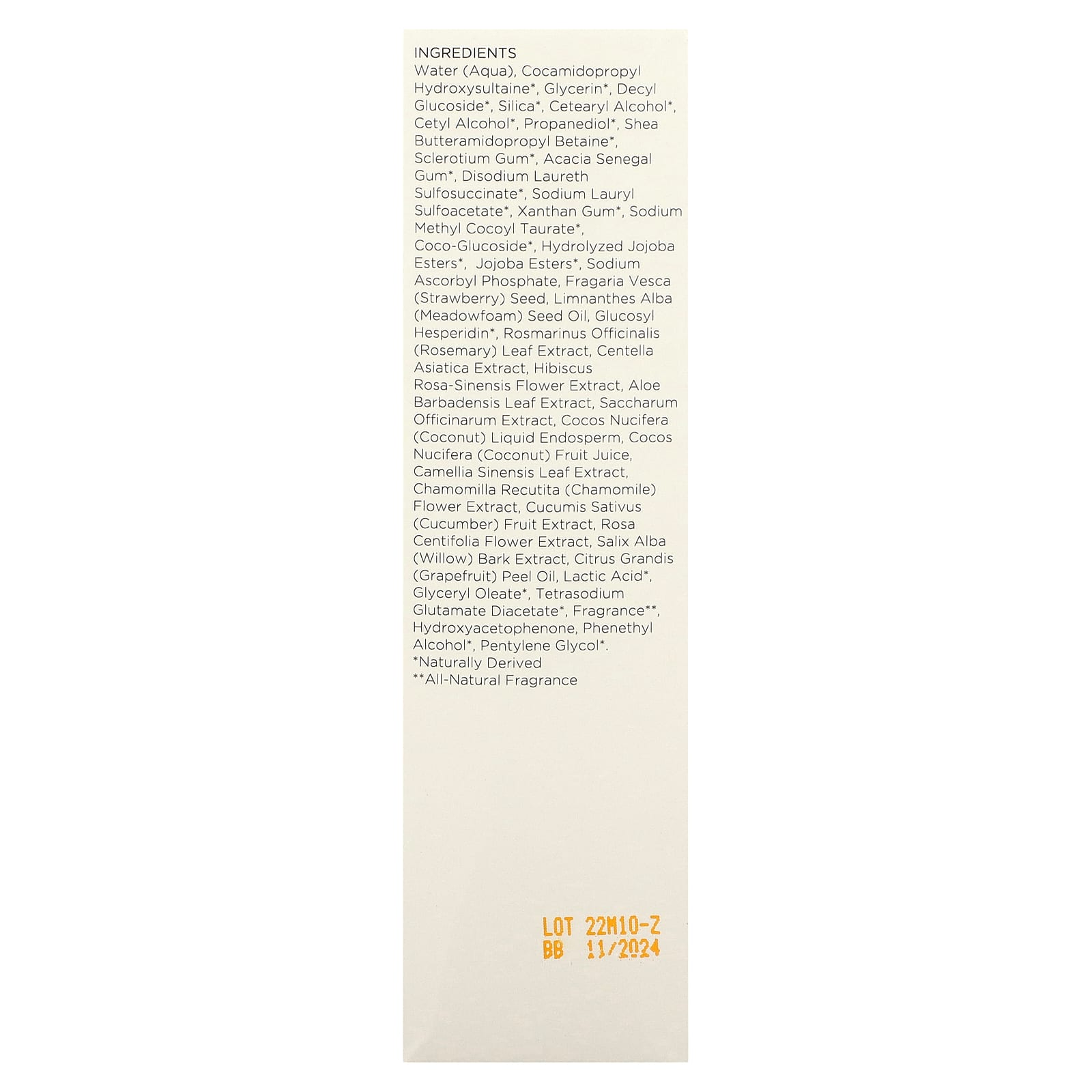 Вода (Aqua), кокамидопропил гидроксисултаин*, глицерин*, децил глюкозид*, диоксид кремния*, цетеариловый спирт*, цетиловый спирт*, пропандиол*, амидопропилбетаин из масла ши*, смола склероций*, смола сенегальской акации (Acacia senegal)*, двунатриевый лаурет сульфосукцинат*, лаурилсульфоацетат натрия*, ксантановая камедь*, натрия метил кокоил таурат*, кокоглюкозид*, гидролизованные эфиры жожоба*, эфиры жожоба*, аскорбил фосфат натрия, семена клубники (Fragaria vesca), масло из семян пенника лугового (Limnanthes alba), глюкозил гесперидин*, экстракт листьев розмарина (Rosmarinus officinalis), экстракт готу колы (Centella asiatica), экстракт цветов гибискуса китайского (Hibiscus rosa-sinensis), экстракт листьев алоэ вера (Aloe barbadensis), экстракт сахарного тростника (Saccharum officinarum), жидкий эндосперм кокоса (Cocos nucifera), сок из плодов кокоса (Cocos nucifera), экстракт листьев зеленого чая (Camellia sinensis), экстракт цветков ромашки (Chamomilla recutita), экстракт плодов огурца (Cucumis sativus), экстракт цветков розы столистной (Rosa centifolia), экстракт коры ивы (Salix alba), масло из цедры грейпфрута (Citrus grandis), молочная кислота*, глицерил олеат*, диацетат глутамата тетранатрия*, отдушка**, гидроксиацетофенон, фенетиловый спирт*, пентилен гликоль*.