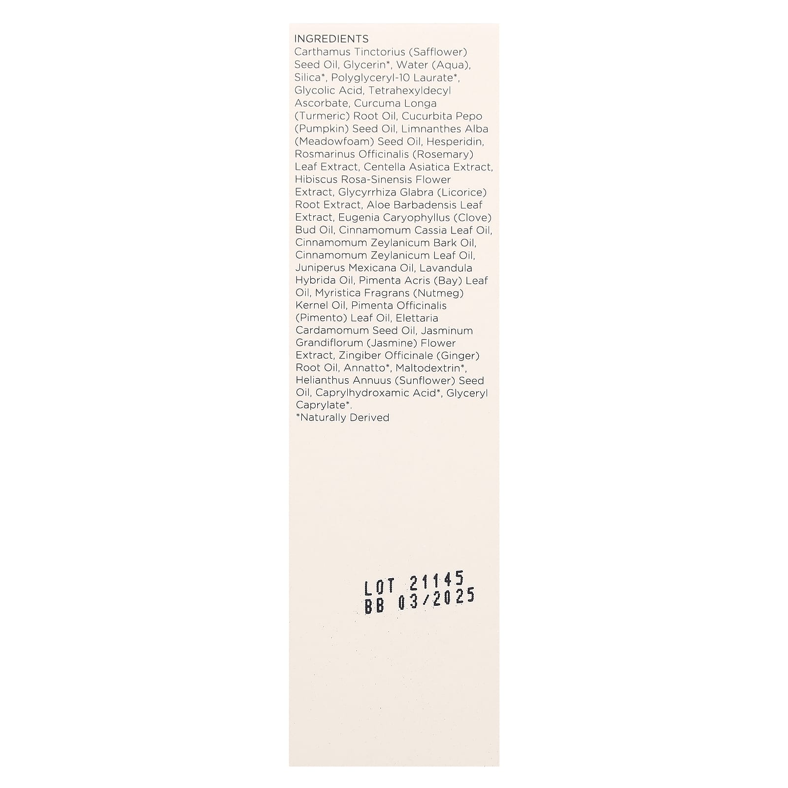 Масло семян сафлора (Carthamus tinctorius), глицерин*, вода (Aqua), диоксид кремния*, полиглицерил-10 лаурат*, гликолевая кислота, тетрагексилдецил аскорбат, масло корня куркумы (Curcuma longa), масло семян тыквы (Cucurbita pepo), масло из семян пенника лугового (Limnanthes alba), гесперидин, экстракт листьев розмарина (Rosmarinus officinalis), экстракт готу колы (Centella asiatica), экстракт цветов гибискуса китайского (Hibiscus rosa-sinensis), экстракт корня солодки (Glycyrrhiza glabra), экстракт листьев алоэ вера (Aloe barbadensis), масло из бутонов гвоздики (Eugenia caryophyllus), масло из листьев коричника китайского (Сinnamomum cassia), масло из коры корицы (Cinnamomum zeylanicum), масло из листьев корицы (Сinnamomum zeylanicum), масло можжевельника мексиканского (Juniperus mexicana), масло лавандина (Lavandula hybrida), масло из листьев пименты кистевидной (Pimenta acris), масло ядер мускатного ореха (Myristica fragrans), масло из листьев овощного перца (Pimenta officinalis), масло из семян кардамона (Elettaria cardamomum), экстракт цветков жасмина (Jasminum grandiflorum), масло корня имбиря (Zingiber officinale), аннато*, мальтодекстрин*, подсолнечное масло (Helianthus annuus), каприлгидроксаминовая кислота*, глицерил каприлат*.