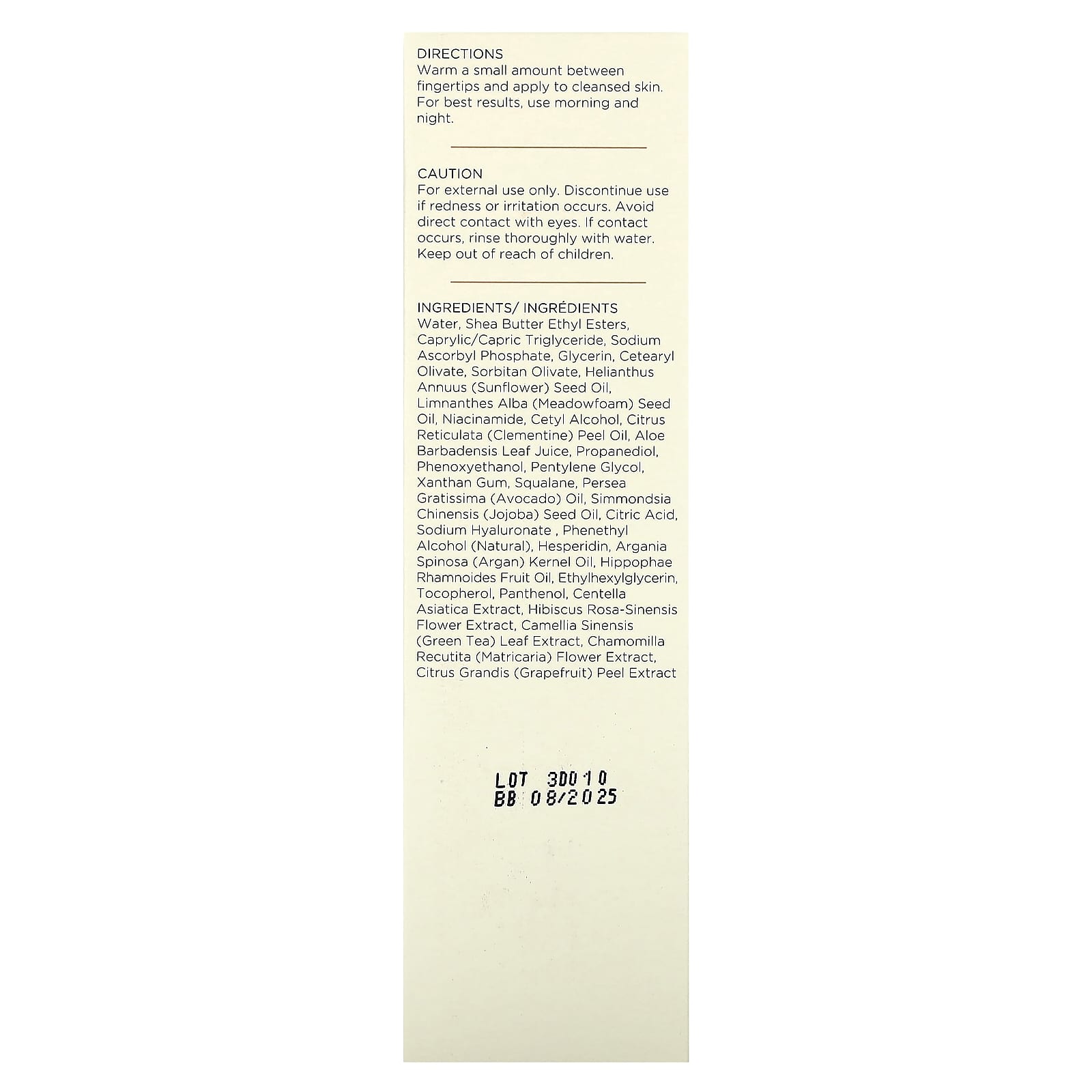 Вода, этиловые эфиры масла ши, каприловый/каприновый триглицерид, аскорбил фосфат натрия, глицерин, цетеарил оливат, сорбитан оливат, подсолнечное масло (Helianthus annuus), масло из семян пенника лугового (Limnanthes alba), никотинамид, цетиловый спирт, масло из цедры клементина (Citrus reticulata), сок из листьев алоэ вера (Aloe barbadensis), пропандиол, феноксиэтанол, пентилен гликоль, ксантановая камедь, сквалан, масло авокадо (Persea gratissima), масло из семян жожоба (Simmondsia chinensis), лимонная кислота, гиалуронат натрия, фенетиловый спирт (натуральный), гесперидин, аргановое масло (Argania spinosa), масло из плодов облепихи крушиновидной (Hippophae rhamnoides), этилгексилглицерин, токоферол, пантенол, экстракт готу колы (Centella asiatica), экстракт цветков гибискуса китайского (Hibiscus rosa-sinensis), экстракт листьев зеленого чая (Camellia sinensis), экстракт цветков ромашки лекарственной (Chamomilla recutita), экстракт кожуры грейпфрута (Citrus grandis).