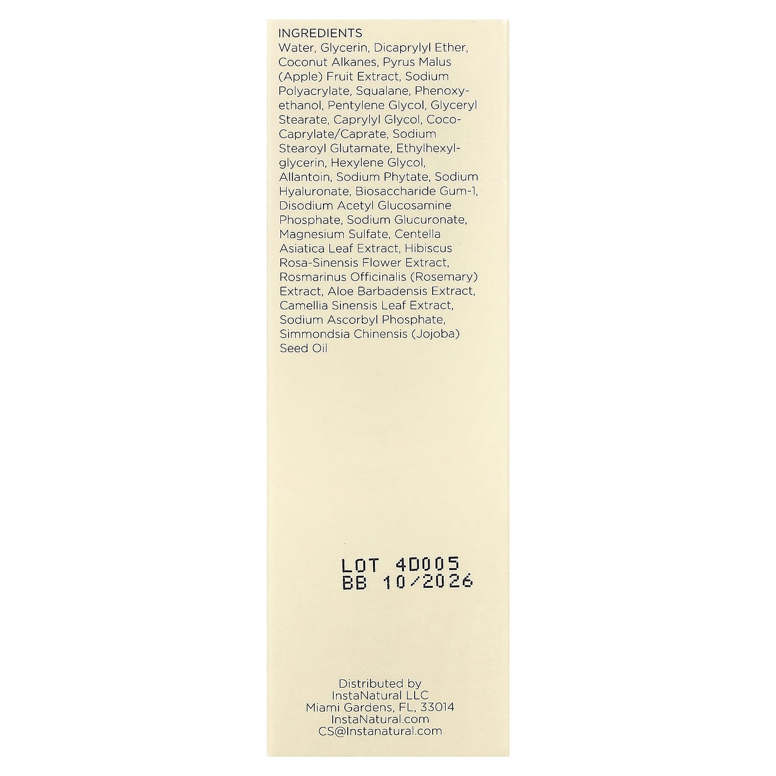 Вода, глицерин, дикаприлиловый эфир, алканы из кокоса, экстракт яблока (Pyrus malus), полиакрилат натрия, сквалан, феноксиэтанол, пентилен гликоль, глицерил стеарат, каприлилгликоль, коко-каприлат/капрат, натрия стеароил глутамат, этилгексилглицерин, гексиленгликоль, аллантоин, фитат натрия, гиалуронат натрия, биосахаридная смола-1, динатрия ацетилглюкозамина фосфат, глюкуронат натрия, сульфат магния, экстракт листьев готу колы (Centella asiatica), экстракт цветков гибискуса китайского (Hibiscus rosa-sinensis), экстракт розмарина (Rosmarinus officinalis), экстракт алоэ вера (Aloe barbadensis), экстракт листьев зелёного чая (Camellia sinensis), аскорбил фосфат натрия, масло семян жожоба (Simmondsia chinensis).