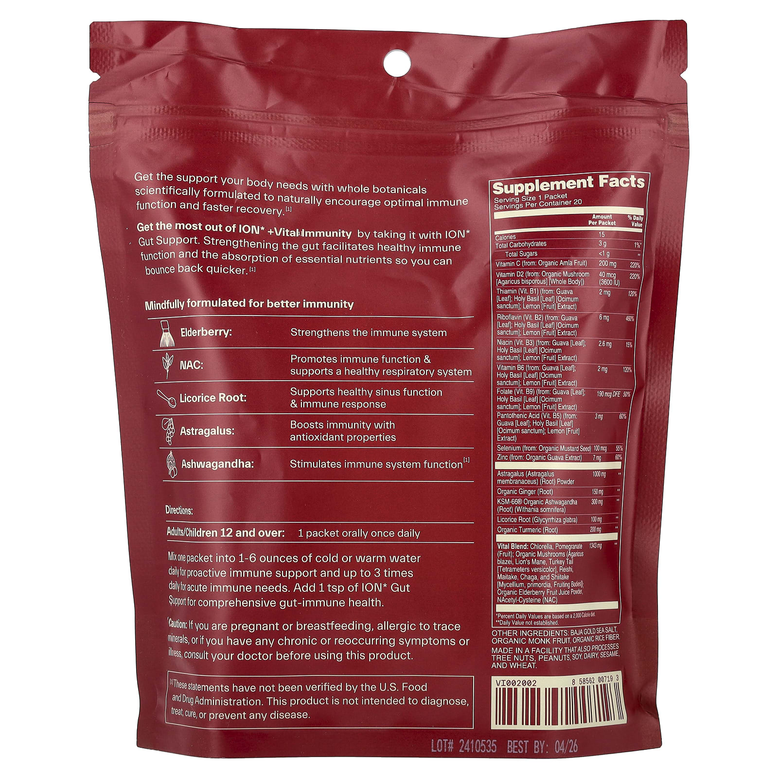 Смешивайте один пакетик с 30–240 мл (30–2 унциями) холодной или теплой воды в день для проактивной поддержки иммунитета и до 3 раз в день при острых иммунных заболеваниях. Добавьте 1 чайную ложку ION Gut Support для полноценного здоровья кишечника.