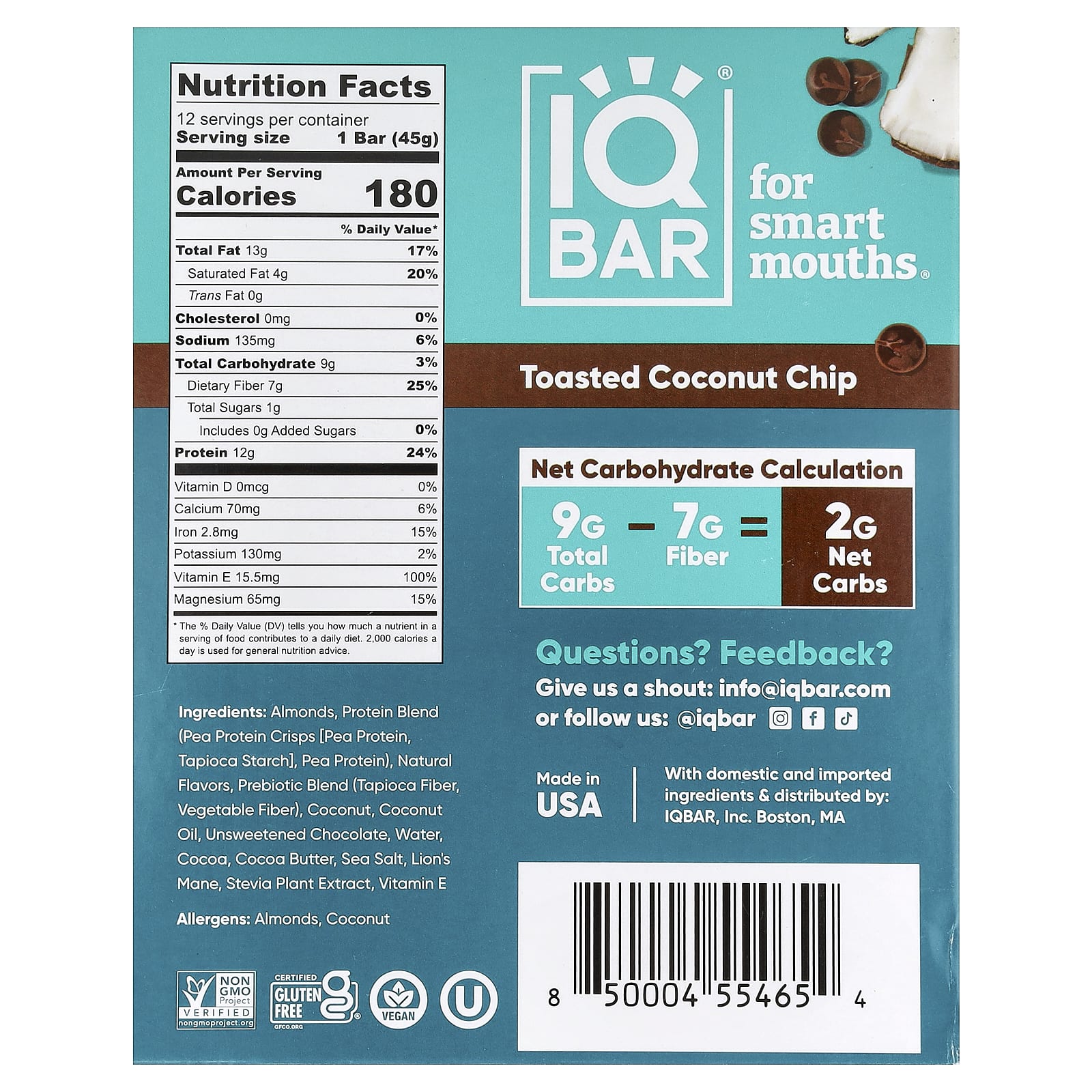 Миндаль, смесь протеинов (чипсы из горохового протеина [гороховый протеин, тапиоковый крахмал], гороховый протеин), натуральные ароматизаторы, смесь пребиотиков (тапиоковая клетчатка, растительная клетчатка), кокос, кокосовое масло, горький шоколад, вода, какао, какао-масло, морская соль, ежовик гребенчатый, экстракт стевии, Витамин E.