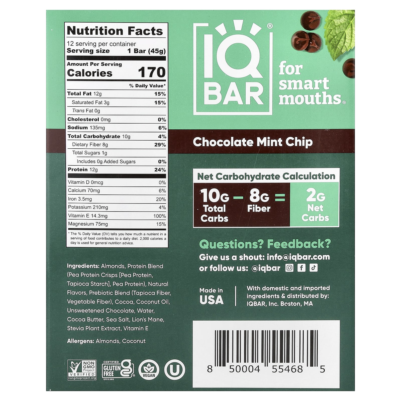 Миндаль, смесь протеинов (чипсы из горохового протеина [гороховый протеин, тапиоковый крахмал], гороховый протеин), натуральные ароматизаторы, смесь пребиотиков (тапиоковая клетчатка, растительная клетчатка), какао, кокосовое масло, горький шоколад, вода, какао-масло, морская соль, ежовик гребенчатый, экстракт стевии, витамин E.