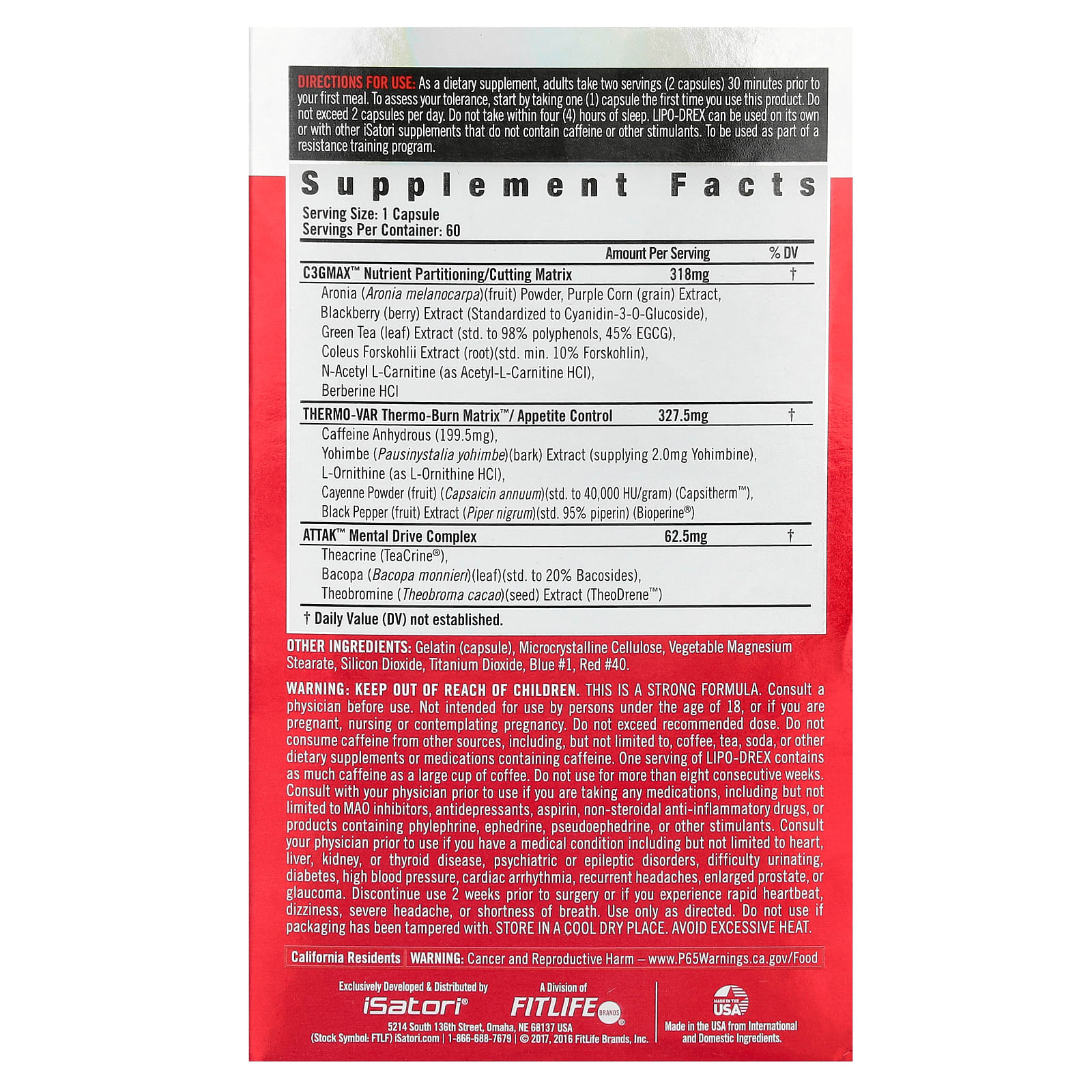 В качестве пищевой добавки для взрослых принимать по две порции (2 капсулы) за 30 минут до первого приема пищи. Чтобы оценить переносимость, начните с приема одной (1) капсулы при первом использовании этого продукта. Не следует принимать более 2 капсул в день. Не принимайте препарат в течение четырех (4) часов после сна. LIPO-DREX можно использовать отдельно или с другими добавками iSatori, которые не содержат кофеина или других стимуляторов. Для использования в рамках программы тренировок с отягощением.