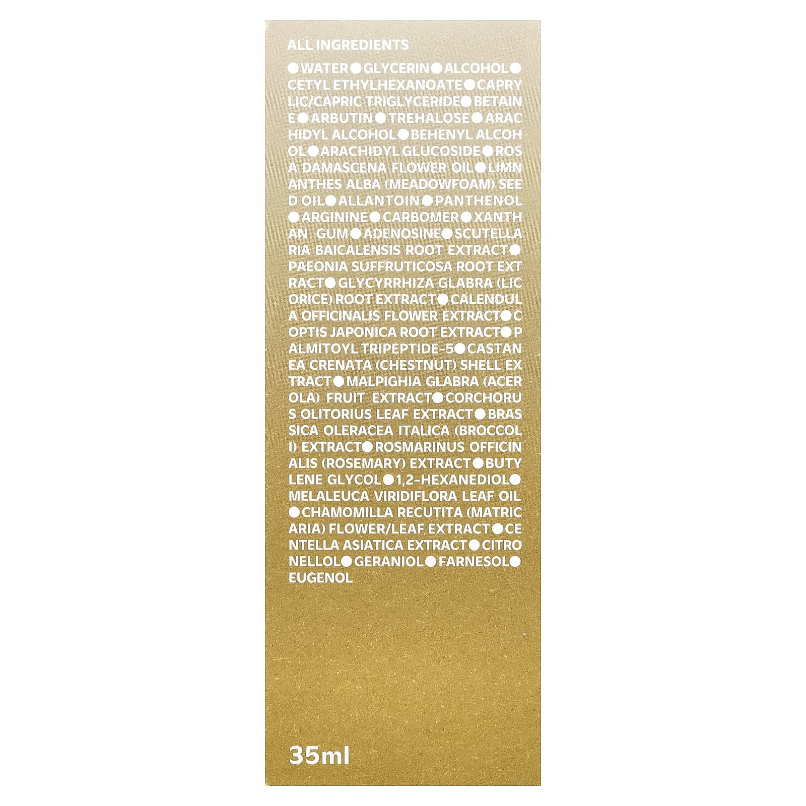 Вода, глицерин, спирт, цетилэтилгексаноат, каприловый/каприновый триглицерид, бетаин, арбутин, трегалоза, арахидиловый спирт, бегениловый спирт, арахидиловый глюкозид, масло из цветков дамасской розы (Rosa damascena), масло из семян пенника лугового (Limnanthes alba), аллантоин, пантенол, аргинин, карбомер, ксантановая камедь, экстракт корня шлемника (Adenosineo scutellaria baicalensis), экстракт корня пиона (Paeonia suffruticosa), экстракт корня солодки (Glycyrrhiza glabra), экстракт цветков календулы (Calendula officinalis), экстракт корня коптиса японского (Coptis japonica), пальмитоил трипептид-5, экстракт скорлупы каштана (castanea crenata), экстракт плодов ацеролы (Malpighia glabra), экстракт листьев рейнутрии (Corchorus olitorius), экстракт брокколи (Brassica oleracea italica), экстракт розмарина (Rosmarinus officinalis), бутиленгликоль, 1,2-гександиол, масло из листьев чайного дерева (Melaleuca viridiflora), экстракт цветков/листьев ромашки лекарственной (Chamomilla recutita), экстракт готу колы (Centella asiatica), цитронеллола, гераниола, фарнезол, эвгенол.