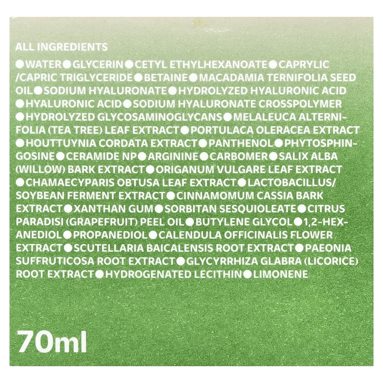 Вода, глицерин, бетаин, трегалоза, гиалуронат натрия, гидролизованная гиалуроновая кислота, гиалуроновая кислота, кроссполимер гиалуроната натрия, гидролизованные гликозаминогликаны, экстракт листьев чайного дерева (Melaleuca alternifolia), экстракт портулака огородного (Portulaca oleracea), экстракт хауттюйнии (Houttuynia cordata), пантенол, масло макадамии (Macadamia ternifolia), фитосфингозин, керамид NP, аргинин, карбомер, экстракт коры ивы (Salix alba), экстракт листьев орегано (Origanum vulgare), экстракт листьев кипарисовика туполистного (Chamaecyparis obtusa), лактобактерии (Lactobacillus) /ферментированный экстракт соевых бобов, экстракт коры кассии (Cinnamomum cassia), ксантановая камедь, масло из цедры грейпфрута (Citrus paradisi), бутиленгликоль, 1,2-гександиол, пропандиол, экстракт цветков календулы (Calendula officinalis), экстракт корня шлемника (Scutellaria baicalensis), экстракт корня пиона (Paeonia suffruticosa), экстракт корня солодки (Glycyrrhiza glabra), гидрогенизированный лецитин, лимонен.