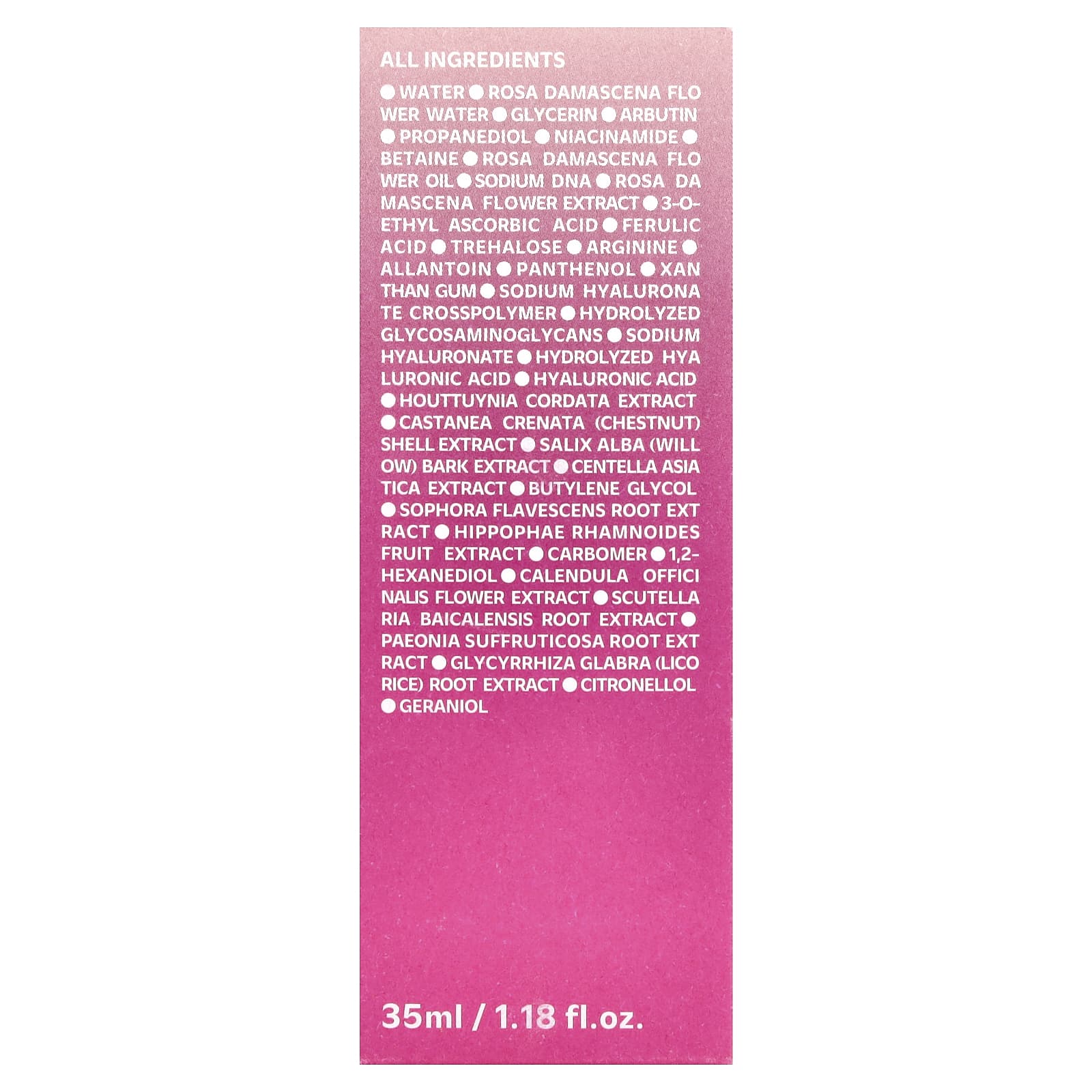 Вода, вода из цветков дамасской розы (Rosa damascena), глицерин, арбутин, пропандиол, никотинамид, бетаин, масло из цветков дамасской розы (Rosa damascena), ДНК натрия, экстракт цветков дамасской розы (Rosa damascena), 3-O-этил-аскорбиновая кислота, феруловая кислота, трегалоза, аргинин и аллантоин, пантенол, ксантановая камедь, кроссполимер гиалуроната натрия, гидролизованные гликозаминогликаны, гиалуронат натрия, гидролизованная гиалуроновая кислота, гиалуроновая кислота, экстракт хауттюйнии (Houttuynia cordata), экстракт скорлупы каштана (castanea crenata), экстракт коры ивы (Salix alba), экстракт готу колы (Centella asiatica), бутиленгликоль, экстракт корня софоры желтоватой (Sophora flavescens), экстракт плодов облепихи крушиновидной (Hippophae rhamnoides), карбомер, 1,2-гександиол, экстракт цветков календулы (Calendula officinalis), экстракт корня шлемника (Scutellaria baicalensis), экстракт корня пиона (Paeonia suffruticosa), экстракт корня солодки (Glycyrrhiza glabra), цитронеллола, гераниол.
