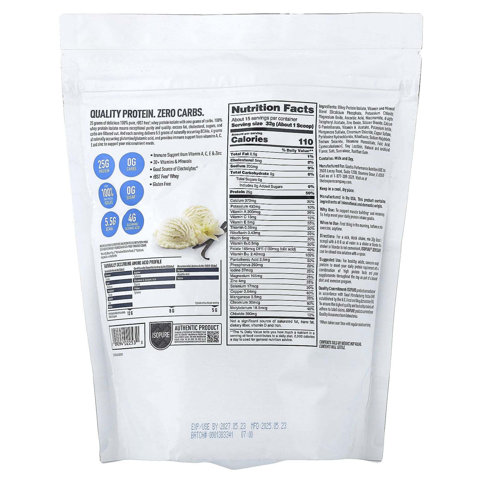 25 г восхитительного 100% чистого изолята сывороточного протеина без р-БСТ† и ноля углеводов. 100% изолят сывороточного протеина означает исключительную чистоту и качество: отфильтровываются излишки жира, холестерина, сахара и углеводов. Каждая порция содержит 5,5 грамма BCAA природного происхождения, 4 грамма глутамина и глутаминовой кислоты природного происхождения и обеспечивает поддержку иммунной системы с помощью витаминов A, C, E и цинка, чтобы удовлетворить потребности в микроэлементах.