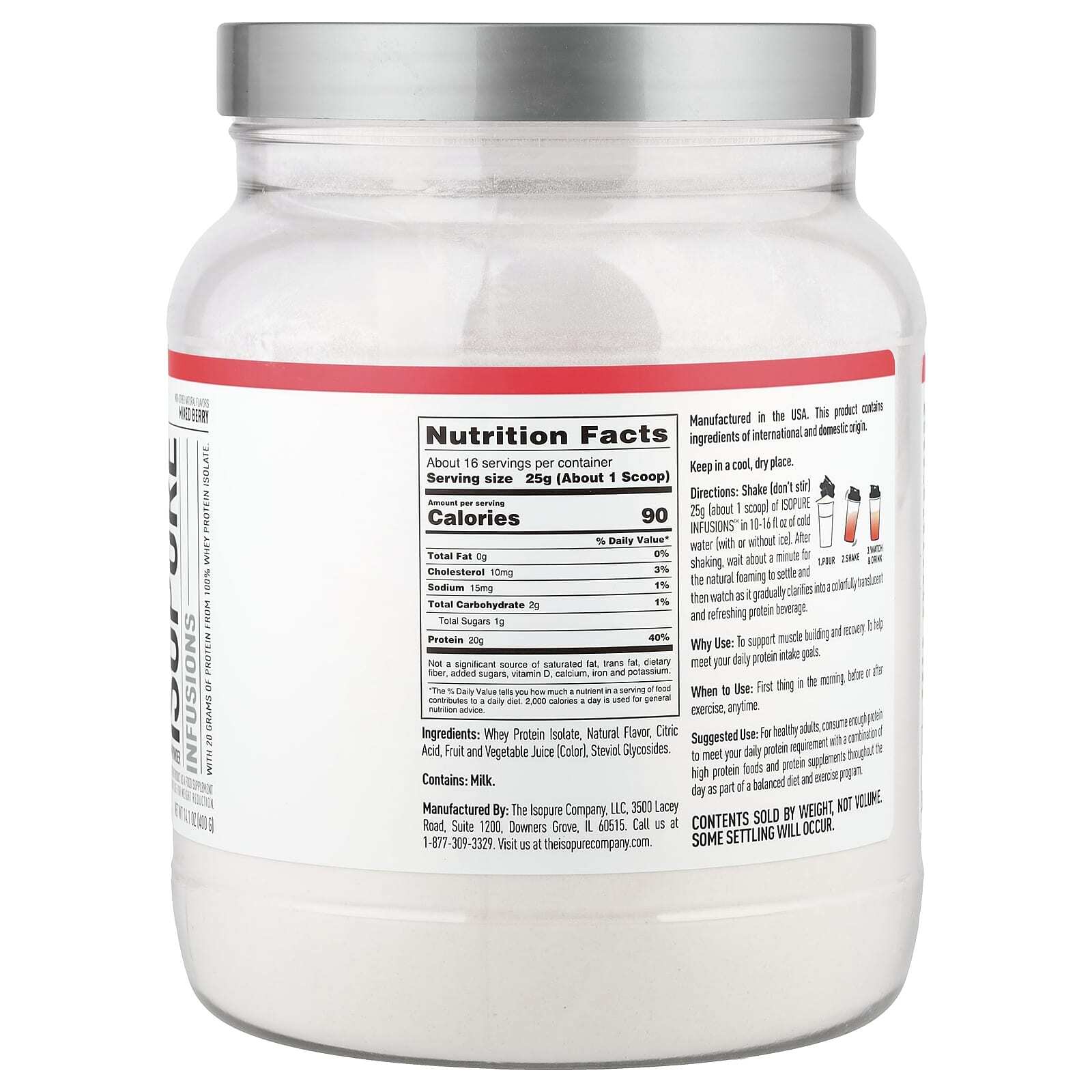 ISOPURE INFUSIONS™ — это не обычный протеиновый порошок, похожий на молочный коктейль. Он имеет освежающий легкий фруктовый вкус и содержит необходимый белок без лишних ингредиентов. Энергично встряхните ISOPURE INFUSIONS™ и наблюдайте, как 20 граммов 100% изолята сывороточного протеина превращаются в яркий прозрачный освежающий напиток прямо на ваших глазах. Вы получите только то, что заявлено: 5 ингредиентов, без жира и добавленного сахара**, всего 90 калорий** в 1 мерной ложке. Изготовлено с натуральными ароматизаторами из малины и голубики и подслащено только экстрактом листьев стевии. Просто, эффективно и вкусно.