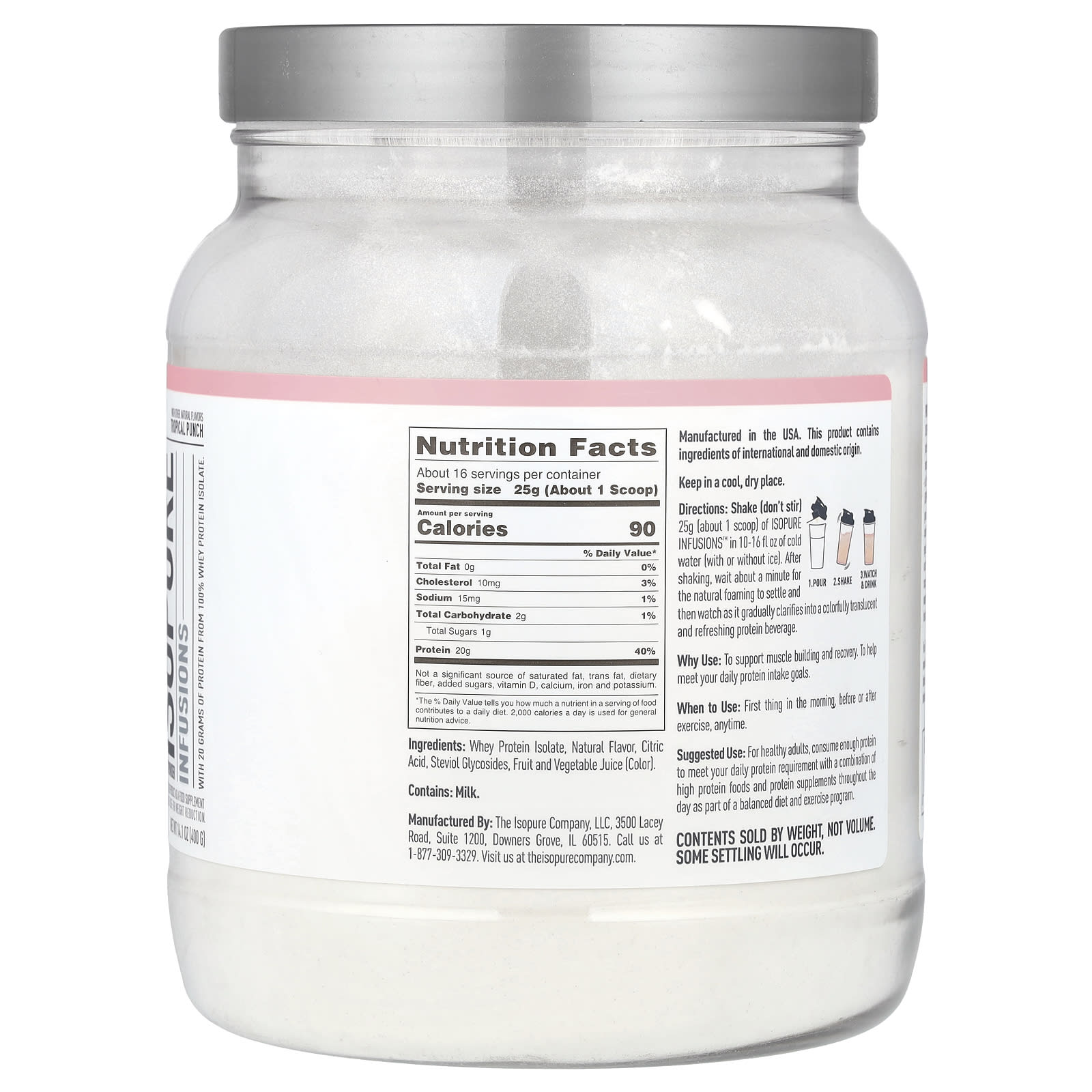 ISOPURE INFUSIONS — это не обычный протеиновый порошок, похожий на молочный коктейль. Он имеет освежающий легкий фруктовый вкус и содержит необходимый белок без лишних ингредиентов. Энергично встряхните ISOPURE INFUSIONS и наблюдайте, как 20 граммов 100% изолята сывороточного протеина превращаются в разноцветный прозрачный освежающий напиток прямо на ваших глазах. Вы получите только то, что заявлено: 5 ингредиентов, без жира и добавленного сахара**, всего 90 калорий** в 1 мерной ложке. Изготовлено с натуральными ароматизаторами ананаса, арбуза и манго и подслащено только экстрактом листьев стевии. Просто, эффективно и вкусно.