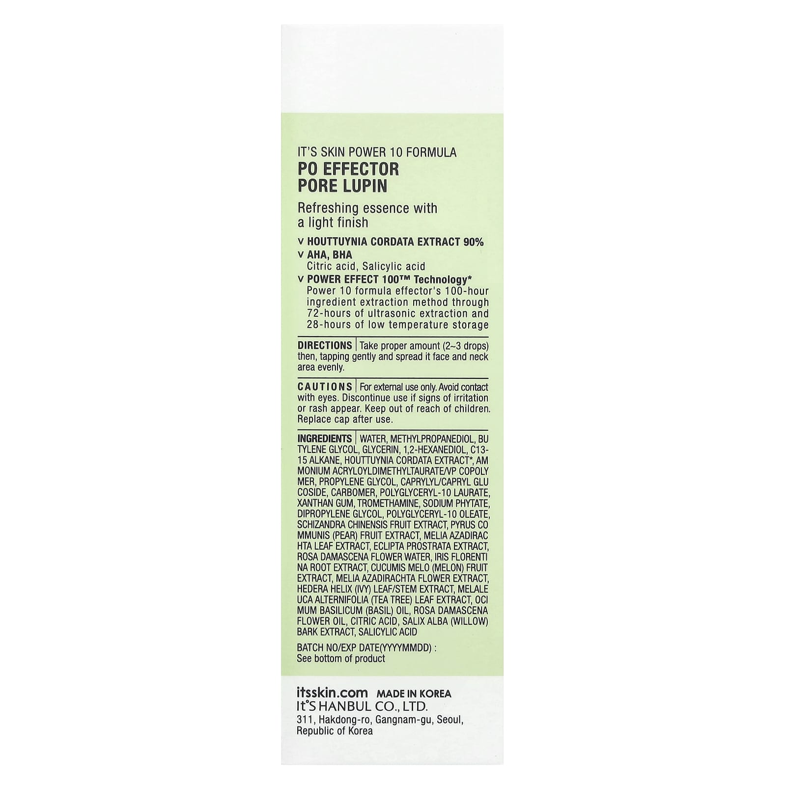 Water, methylpropanediol, butylene glycol, glycerin, 1,2-hexanediol, c13-15 alkane, houttuynia cordata extract, ammonium acryloyldimethyltaurate/vp copolymer, propylene glycol, caprylyl/capryl glucoside, carbomer, polyglyceryl-10 laurate, xanthan gum, tromethamine, sodium phytate, dipropylene glycol, polyglyceryl-10 oleate, schizandra chinensis fruit extract, pyrus communis (pear) fruit extract, melia azadirachta leaf extract, eclipta prostrata extract, rosa damascena flower water, iris florentina root extract, cucumis melo (melon) fruit extract, melia azadirachta flower extract, hedera helix (ivy) leaf/stem extract, melaleuca alternifolia (tea tree) leaf extract, ocimum basilicum (basil) oil, rosa damascena flower oil, citric acid, salix alba (willow) bark extract, salicylic acid.
