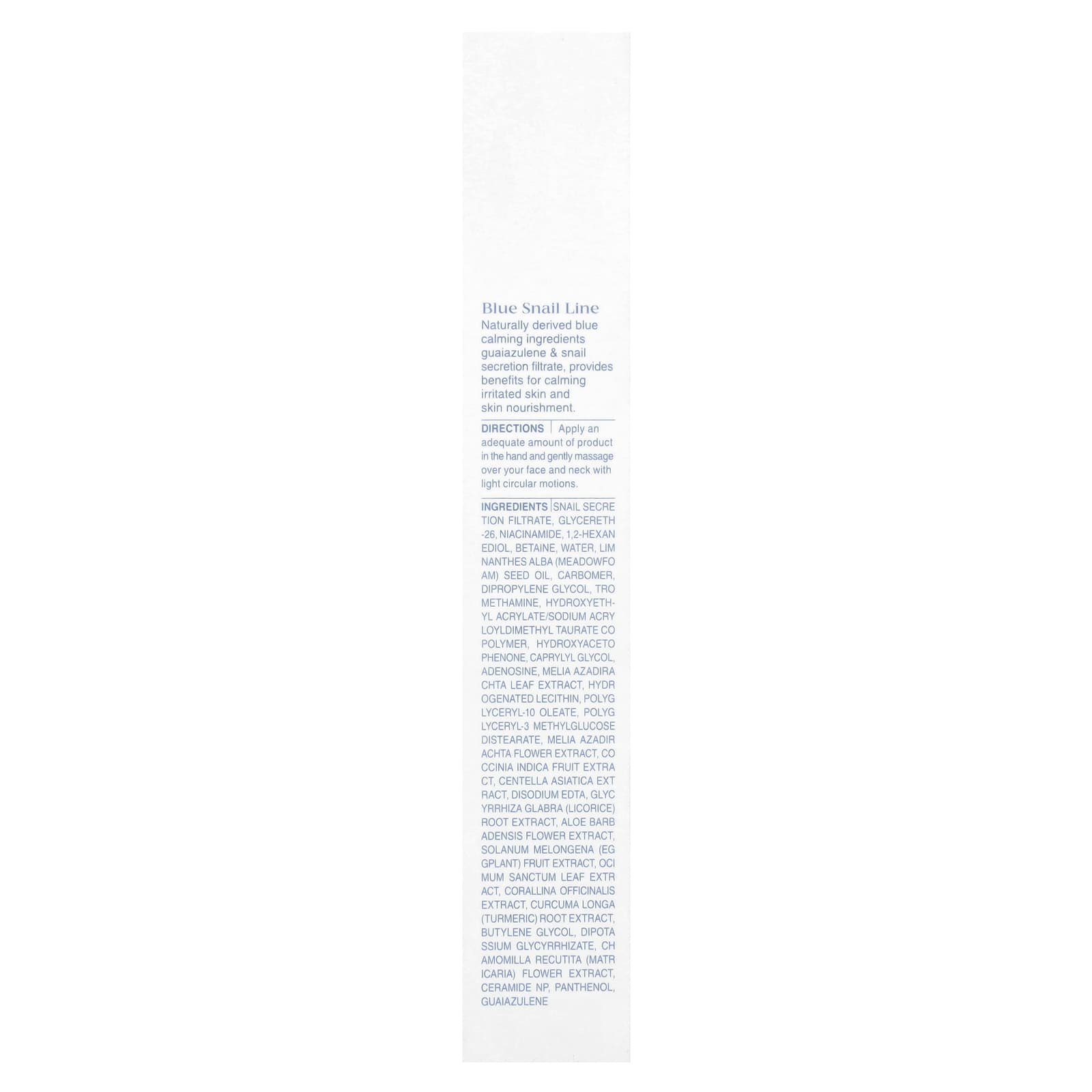 Натуральные синие успокаивающие ингредиенты гваязулен и фильтрат секрета улитки успокаивают раздраженную кожу и питают ее.