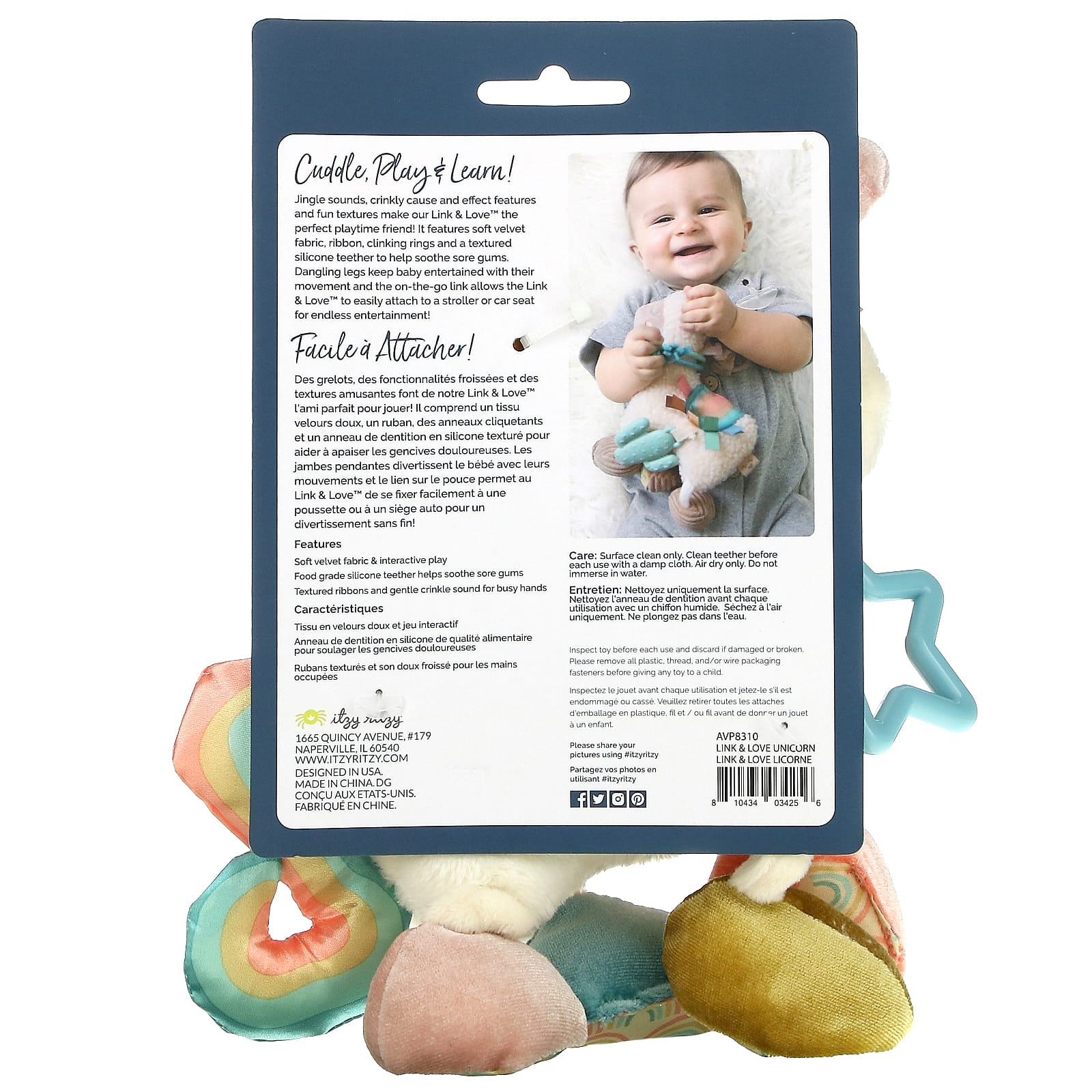 Звук звонка, морщинистые причинно-следственные связи и забавные текстуры делают нашу ссылку & Love ™ - идеальный друг для игр! В его состав входит мягкий бархат, лента, звенящие кольца и текстурированный силиконовый прорезыватель для зубов, которые помогают успокоить воспаленные десны. Свисающие ножки развлекают ребенка своими движениями, а функция ссылки & Love ™, который можно легко прикрепить к коляске или автокреслу, и вы получите бесконечное удовольствие!
