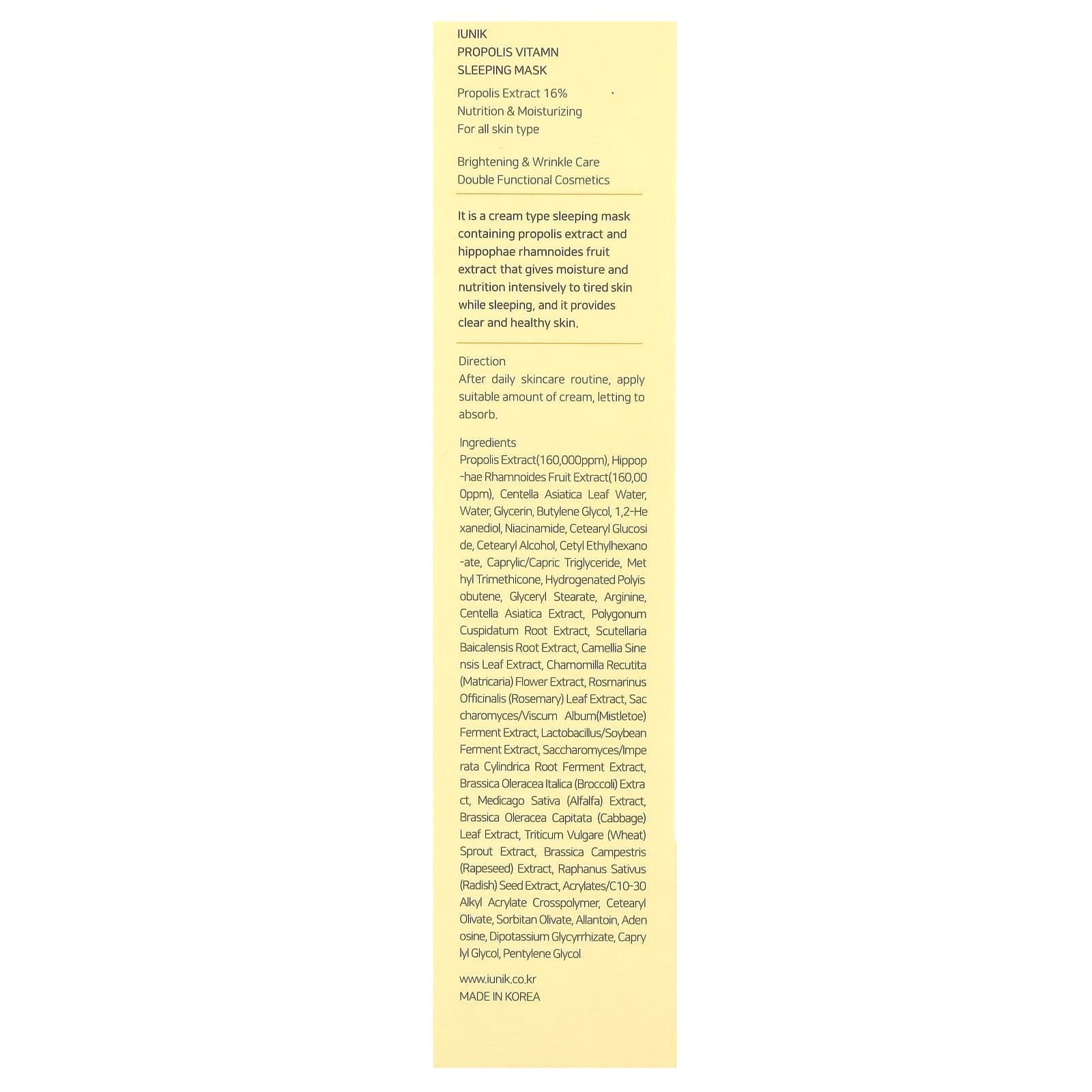 Эта кремовая ночная маска содержит экстракт прополиса и экстракт плодов облепихи рамновидной (Hippophae rhamnoides). Они интенсивно увлажняют и питают уставшую кожу во время сна, делая ее чистой и здоровой.