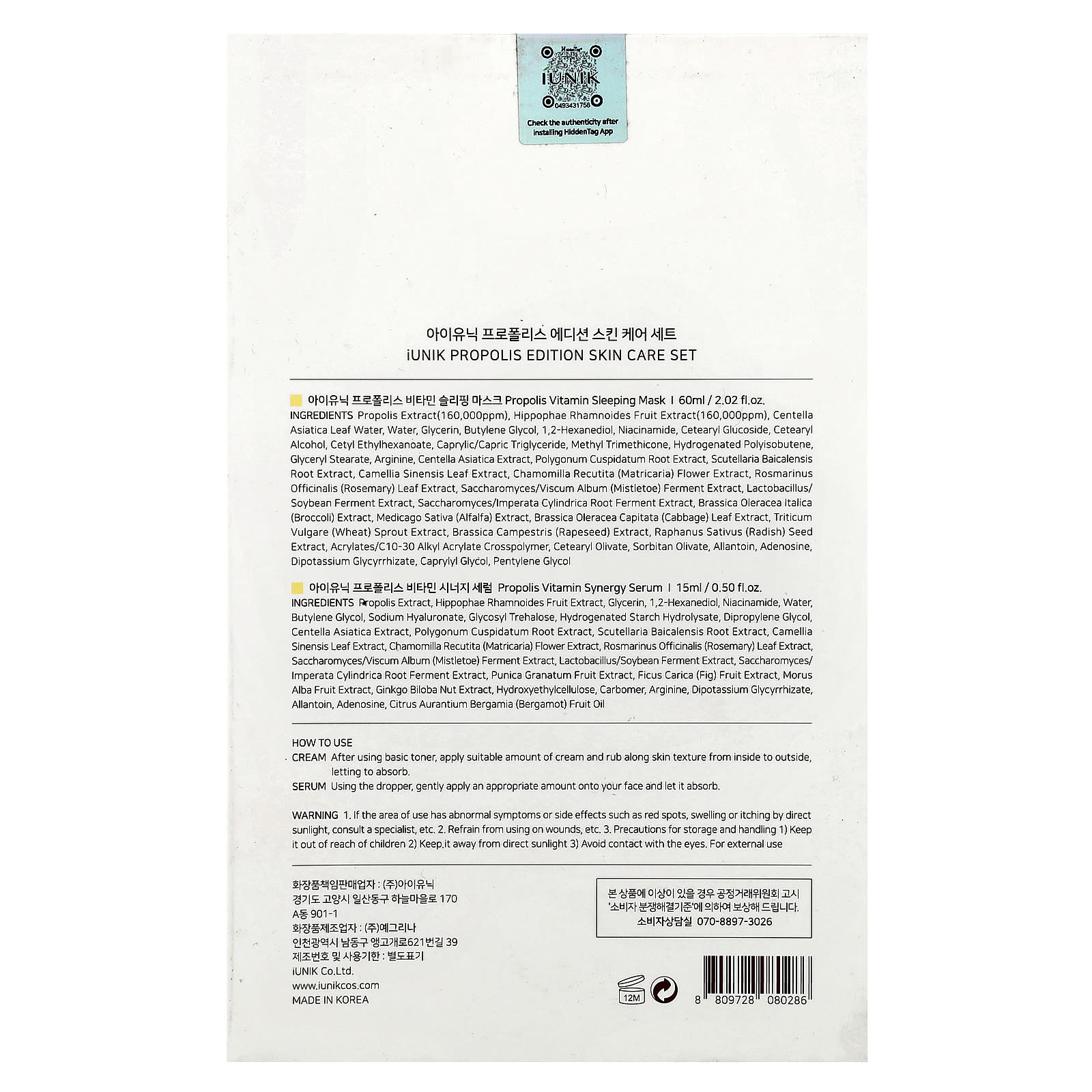 Propolis extract(160,000ppm), hippophae rhamnoides fruit extract(160,000ppm), centella asiatica leaf water, water, glycerin, butylene glycol, 1,2-hexanediol, niacinamide, cetearyl glucoside, cetearyl alcohol, cetyl ethylhexanoate, caprylic/capric triglyceride, methyl trimethicone, hydrogenated polyisobutene, glyceryl stearate, arginine, centella asiatica extract, polygonum cuspidatum root extract, scutellaria baicalensis root extract, camellia sinensis leaf extract, chamomilla recutita (matricaria) flower extract, rosmarinus officinalis (rosemary) leaf extract, saccharomyces/viscum album (mistletoe) ferment extract, lactobacillus/ soybean ferment extract, saccharomyces/imperata cylindrica root ferment extract, brassica oleracea italica (broccoli) extract, medicago sativa (alfalfa) extract, brassica oleracea capitata (cabbage) leaf extract, triticum vulgare (wheat) sprout extract, brassica campestris (rapeseed) extract, raphanus sativus (radish) seed extract, acrylates/c10-30 alkyl acrylate crosspolymer, cetearyl olivate, sorbitan olivate, allantoin, adenosine, dipotassium glycyrrhizate, caprylyl glycol, pentylene glycol.