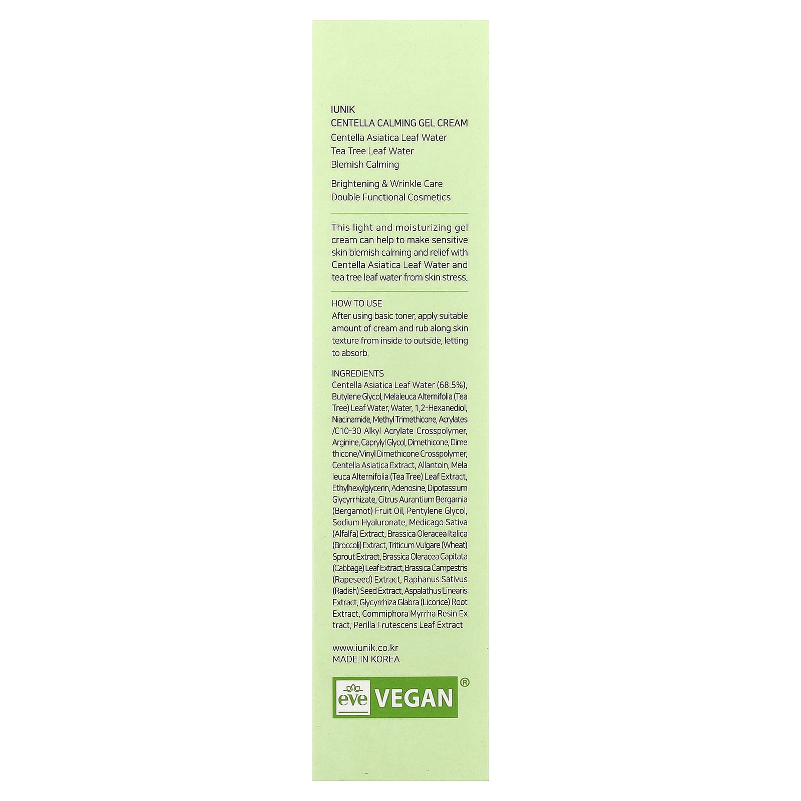 Вода из листьев готу колы (Centella asiatica) (68,5%), бутиленгликоль, вода из листьев чайного дерева (Melaleuca alternifolia), вода, 1,2-гександиол, никотинамид, метилтриметикон, акрилат/c10-30 алкил акрилат кроссполимер, аргинин, каприлилгликоль, диметикон, диметикон/винил диметикон кроссполимер, экстракт готу колы (Centella asiatica), аллантоин, экстракт листьев чайного дерева (Melaleuca alternifolia), этилгексилглицерин, аденозин, дикалия глицирризат, масло бергамота (Citrus aurantium bergamia), пентилен гликоль, гиалуронат натрия, экстракт люцерны (Medicago sativa), экстракт брокколи (Brassica oleracea italica), экстракт ростков пшеницы (Triticum vulgare), экстракт листьев капусты огородной (Brassica oleracea), экстракт рапса (Brassica campestris), экстракт семян редиса (Raphanus sativus), экстракт ройбуша (Aspalathus linearis), экстракт корня солодки (Glycyrrhiza glabra), экстракт камеди мирры (Commiphora myrrha), экстракт листьев периллы (Perilla ocymoides).