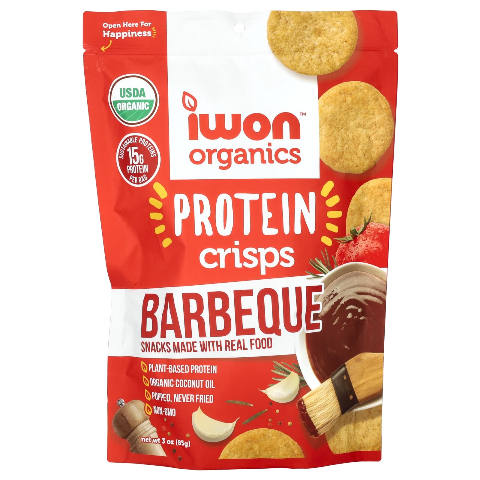 Смесь органических белков IWON ™ (зеленый горошек *, мука из коричневого риса *, гороховый протеин *), кокосовое масло *, приправа для барбекю * (тростниковый сахар-сырец *, рисовая мука *, морская соль, томатный порошок *, дрожжевой экстракт *, луковый порошок *, паприка *, кайенский перец *, натуральный ароматизатор дыма, лимонная кислота, олеорезин паприки *).